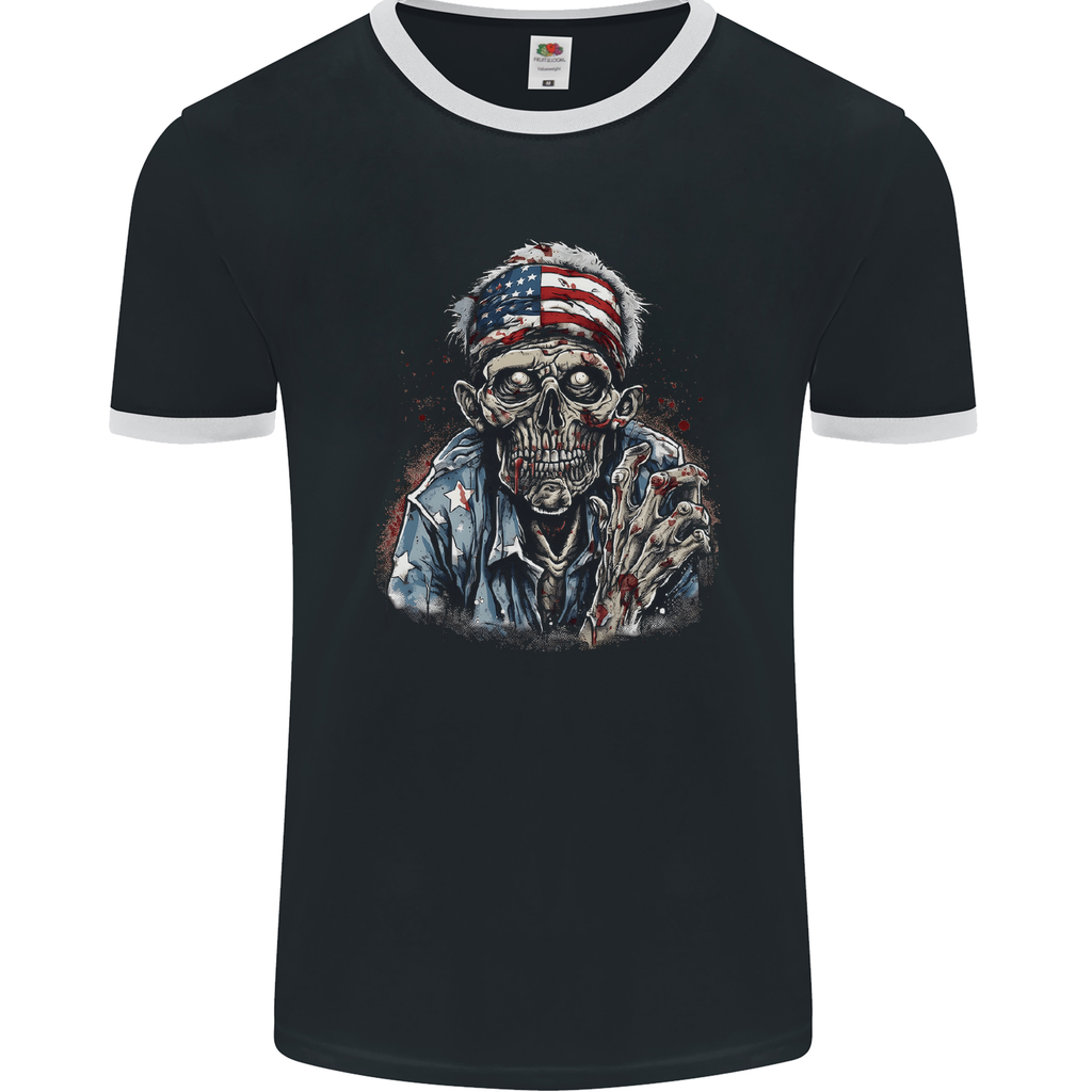 Welcome to the spooky and patriotic fusion of the American Zombie USA Flag Halloween Mens Ringer T-Shirt by FotL. Unleash your undead spirit with this unique and captivating t-shirt that combines American pride with Halloween vibes.
