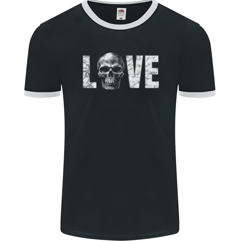Made with durable materials, this t-shirt will hold up well in the wash, retaining its vibrant graphics and snug fit. Celebrate the spooky season and make a statement against conventional love with the Love Skull Halloween Anti-Valentines Day Men's Ringer T-Shirt.