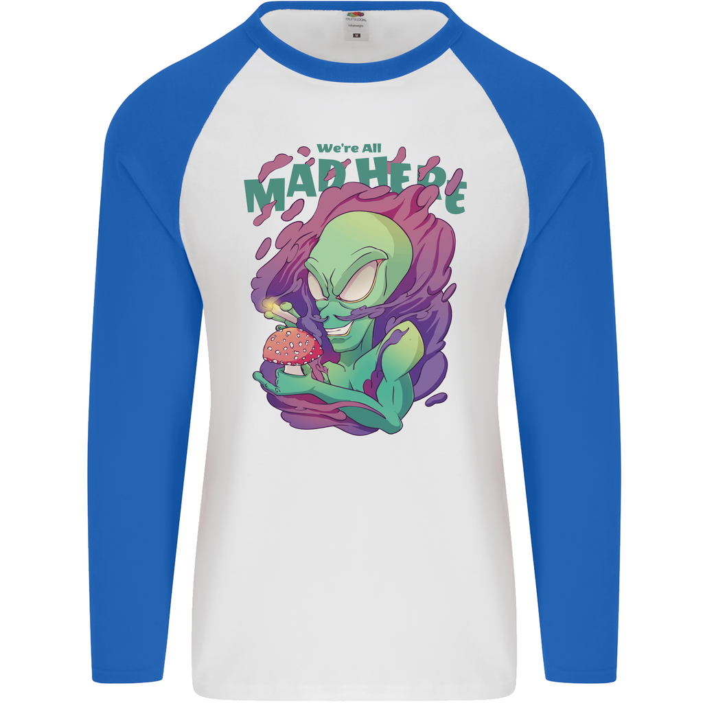 Don’t miss your chance to add this unique piece to your collection. Order the All Mad Here Alien Magic Mushrooms Men's Long Sleeve Baseball T-Shirt today for a fun and funky addition to your wardrobe!