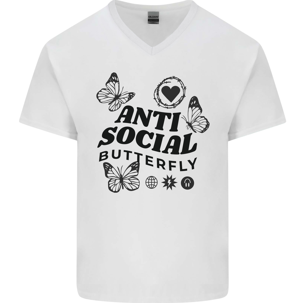 So why blend in when you were born to stand out? Elevate your style game with the Antisocial Butterfly Mens V-Neck Cotton T-Shirt and make your mark on the world, one bold statement at a time.