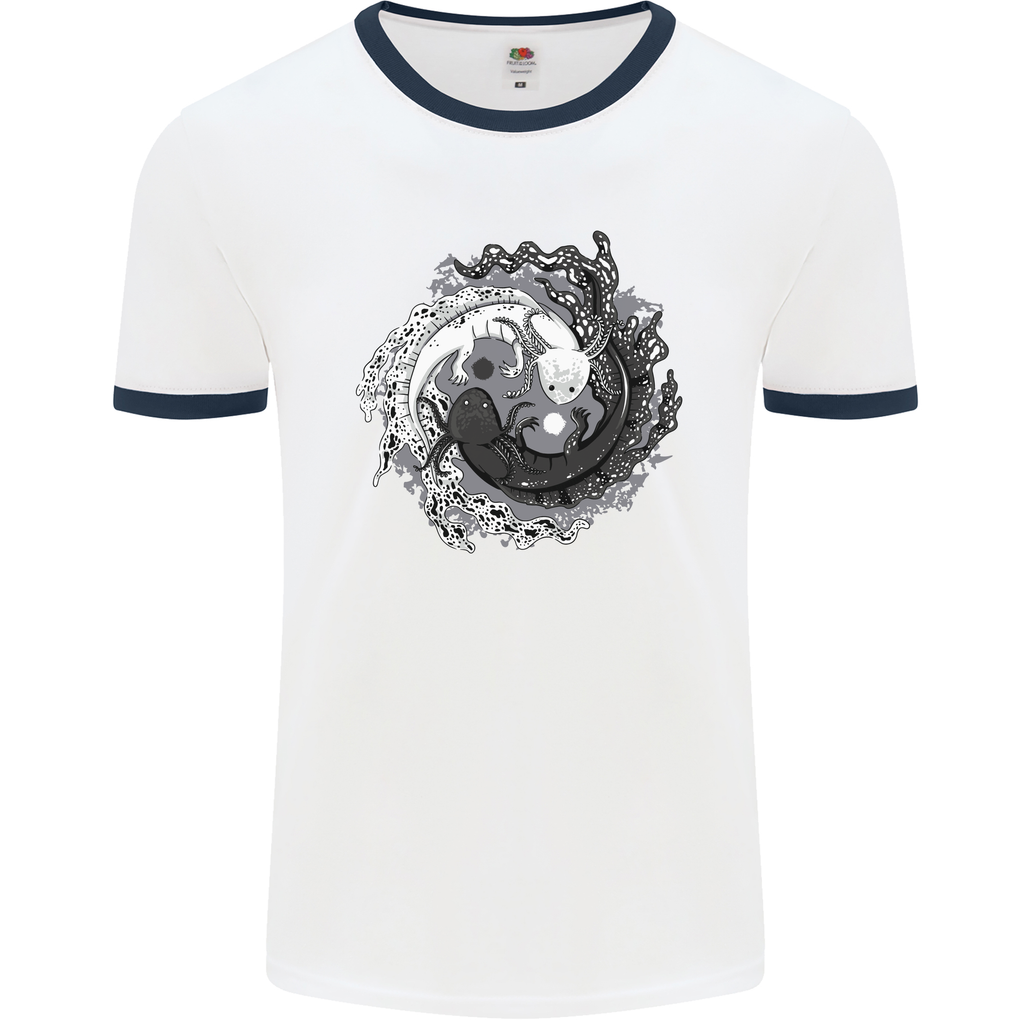 Welcome to the world of harmony with the Axolotl Yin Yang Men's Ringer T-Shirt. Embrace balance with this stylish yet comfortable tee that brings together the iconic Yin Yang symbol and the unique charm of the axolotl.
