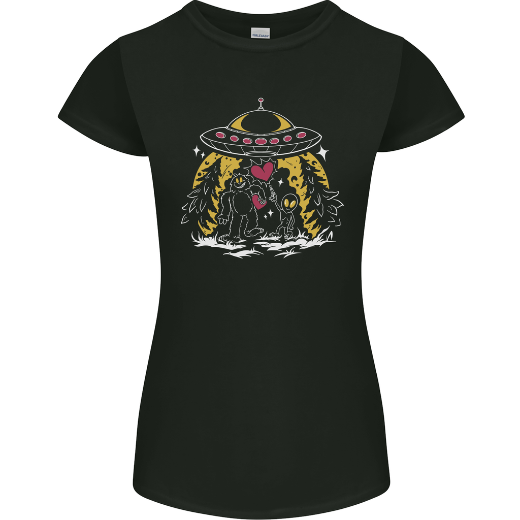 Whether you’re at a comic convention, a casual outing with friends, or just lounging at home, this t-shirt will be your go-to option. Embrace your love for the mystical and mysterious with the Bigfoot & Alien UFO Women’s Petite Cut T-Shirt, where comfort meets style in a galaxy of fun!