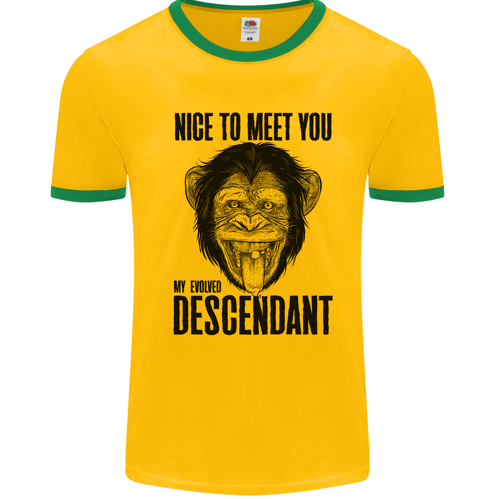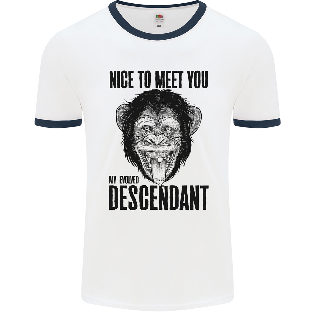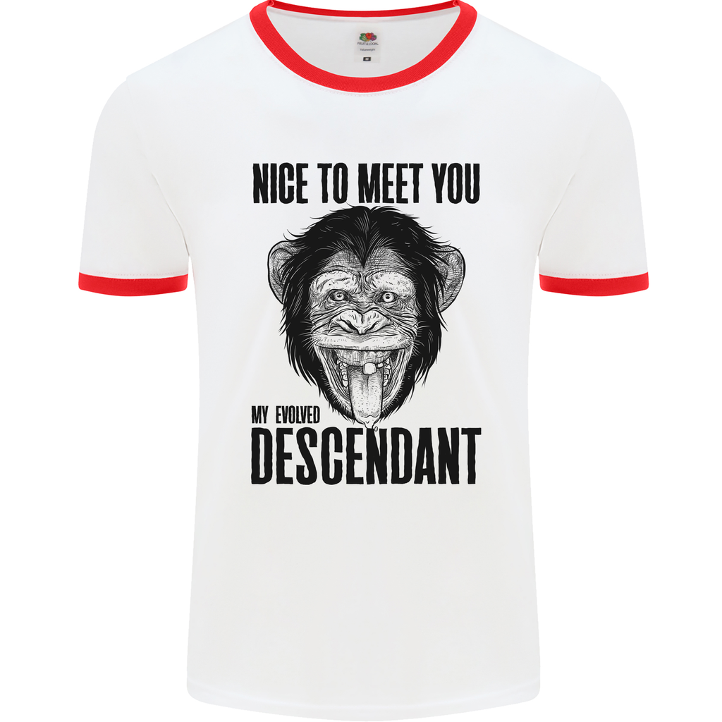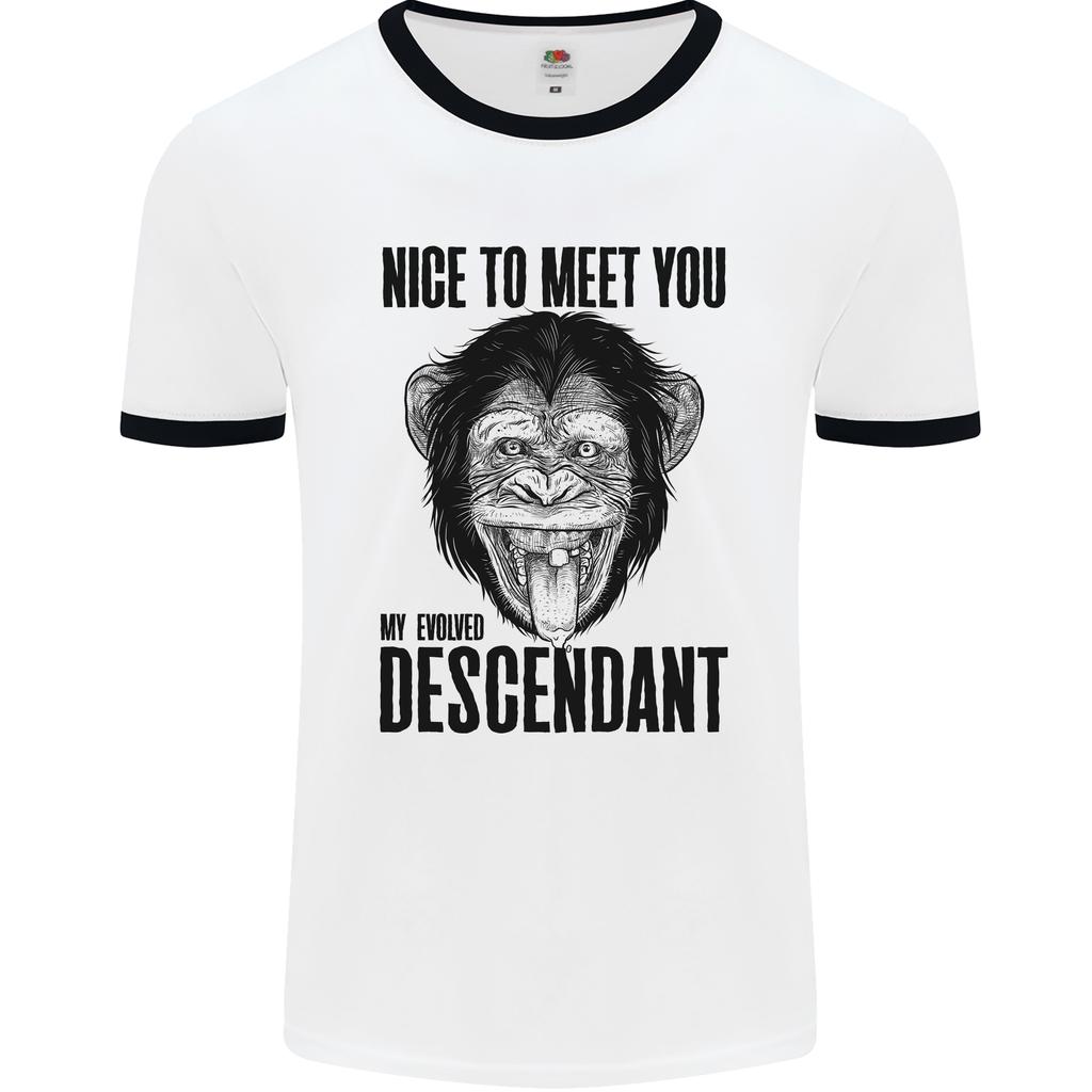 Add a dose of humour to your outfit rotation with our Chimp Evolved Descendant Funny Monkey Ape Men's Ringer T-Shirt. Make a statement, stay comfortable, and let your playful side shine through with this one-of-a-kind tee!