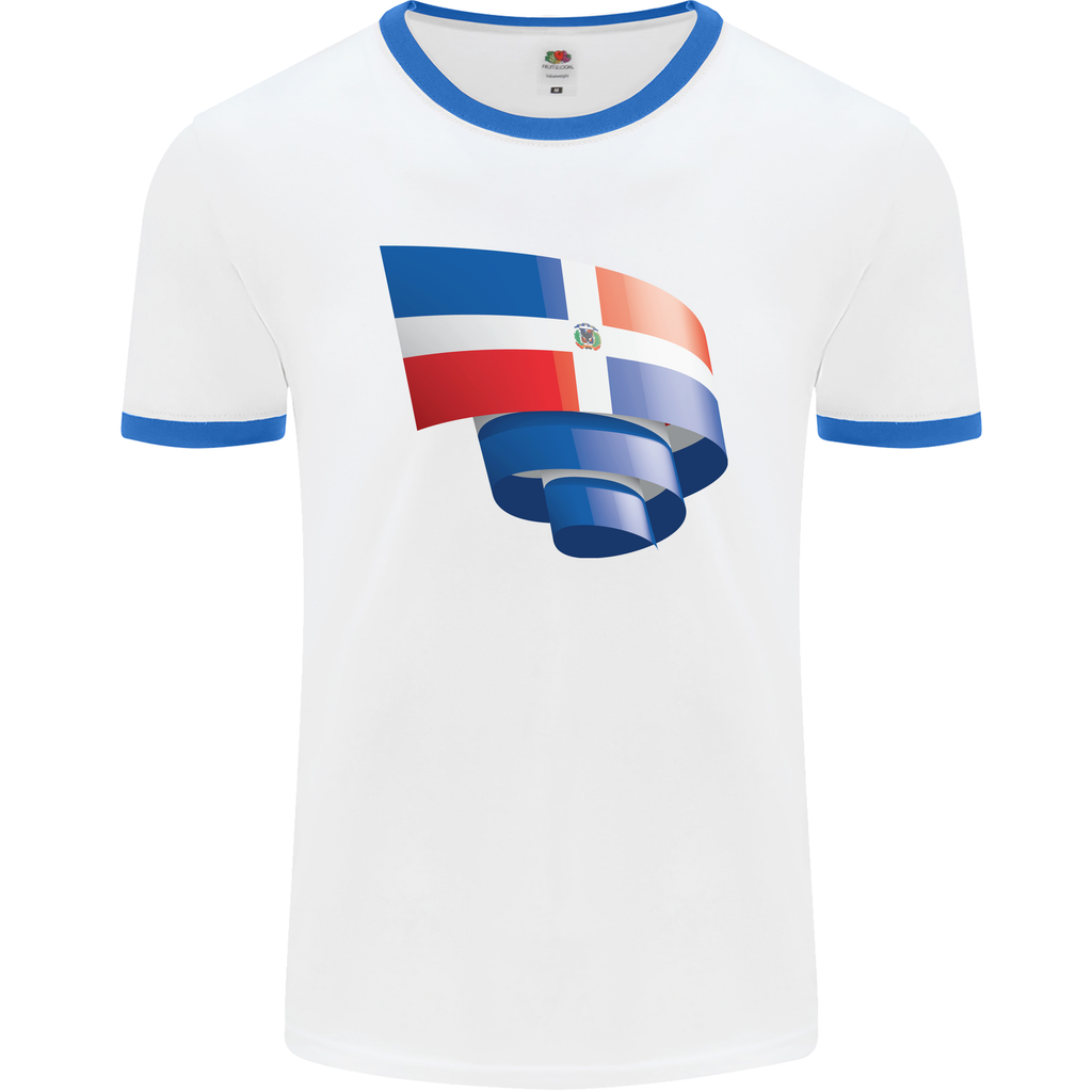 Embrace your Dominican heritage with the Curled Dominican Republic Flag Dominicanos Day Men's Ringer T-Shirt and wear your pride on your sleeve - quite literally!