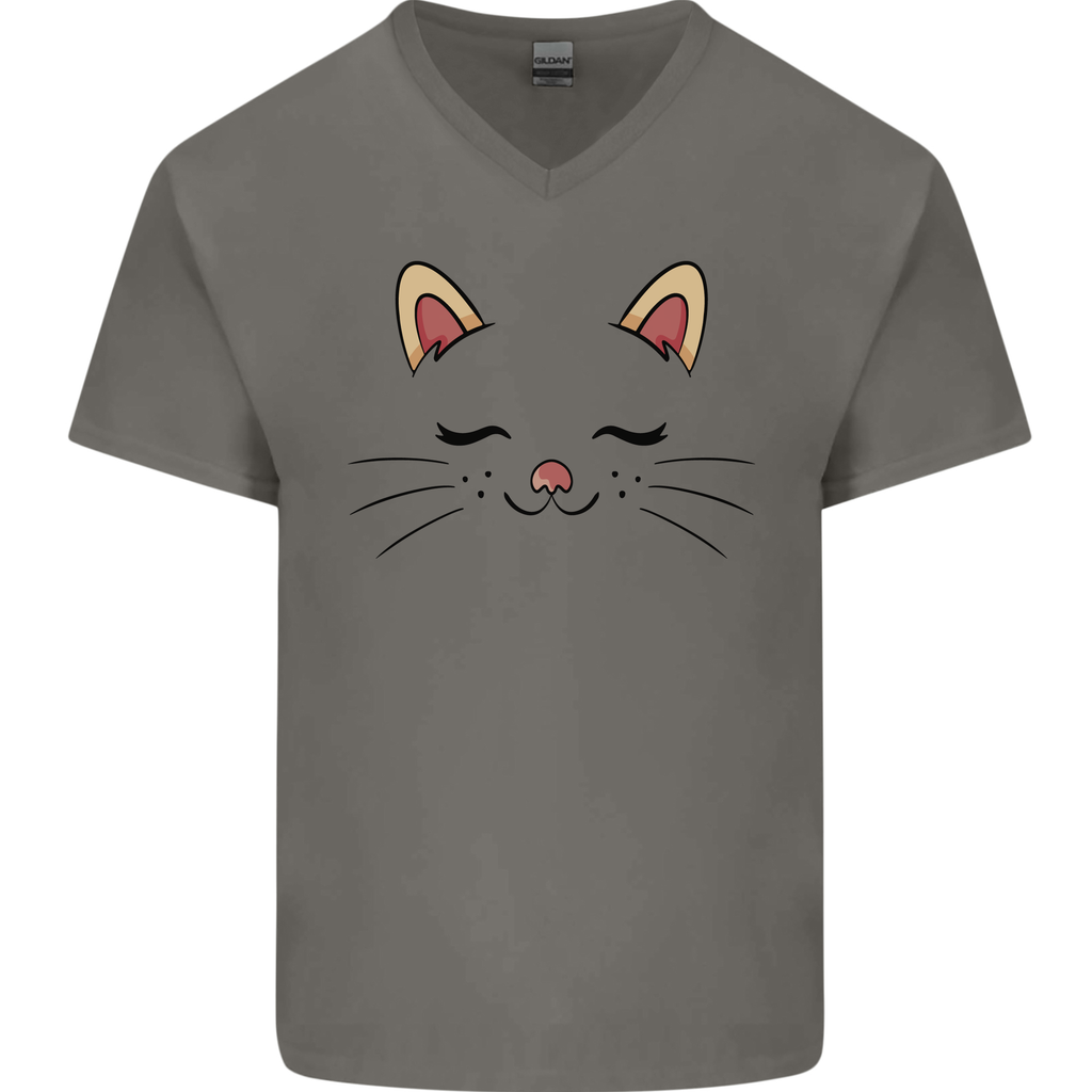 Cute Cat Face Mens V-Neck Cotton T-Shirt