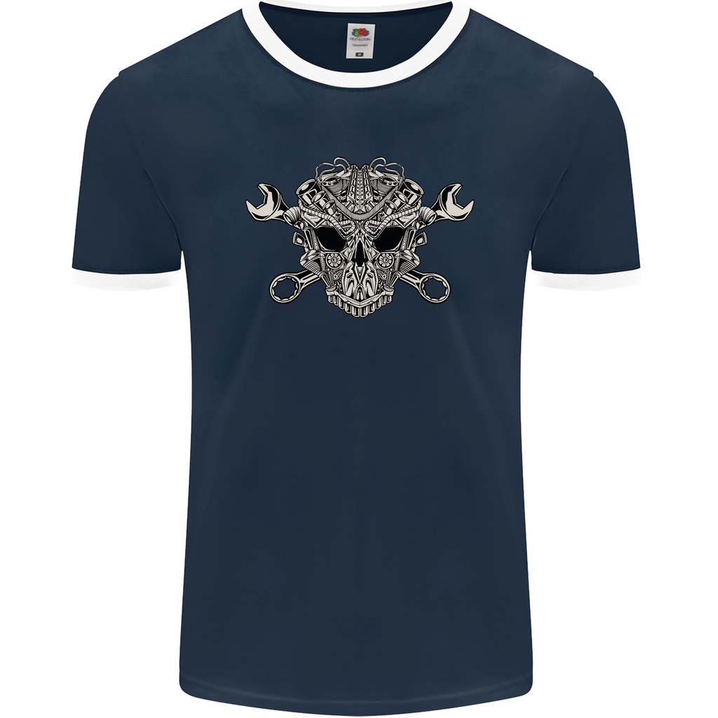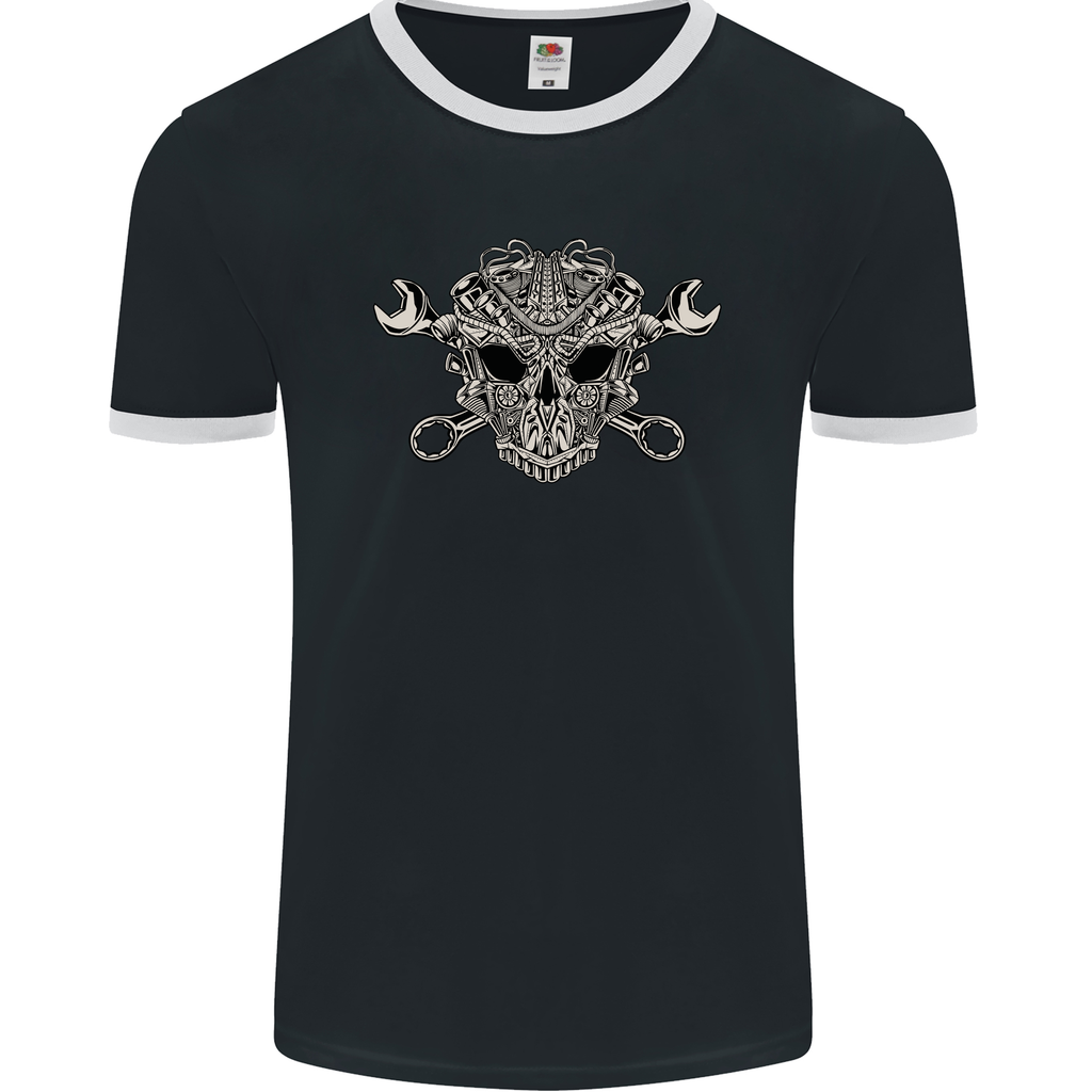 Get ready to rev up your style with the Engine Skull Mechanic Car Biker Motorbike Mens Ringer T-Shirt by FotL. This edgy t-shirt perfectly blends a rebellious spirit with a touch of mechanical charm, making it a must-have for all automotive and biker enthusiasts.