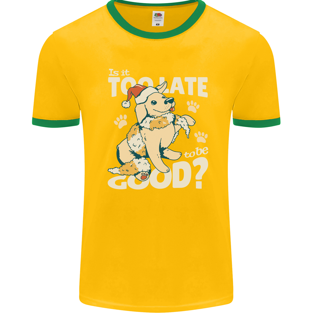 This premium ringer t-shirt features a unique design showcasing a mischievous dog who is cheekily declaring that it's "Too Late to Be Good" this year. The combination of high-quality fabric and attention-grabbing print makes it a perfect choice for those who love to add a touch of fun to their wardrobe during the holiday season.