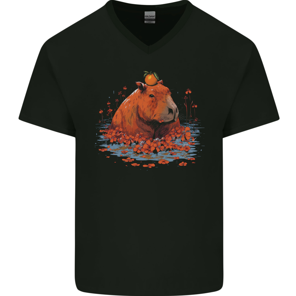 Welcome to the world of casual comfort and playful style with our Orange Capybara Mens V-Neck Cotton T-Shirt. Perfect for those who appreciate unique and quirky design elements, this t-shirt is a stand-out addition to any wardrobe.