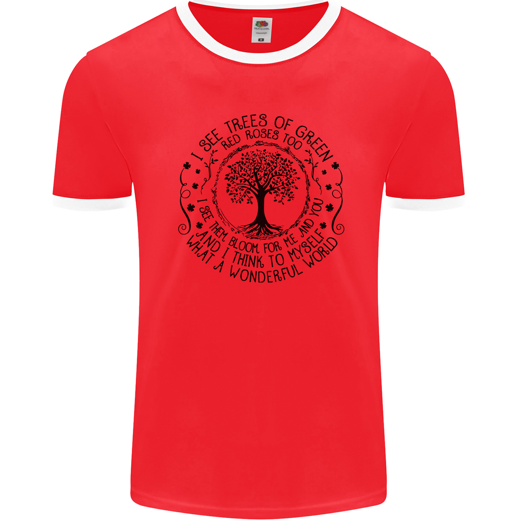 Embrace the beauty of nature with the "Trees What a Wonderful World" Mens Ringer T-Shirt. Join the movement, celebrate trees, and make a difference in style!