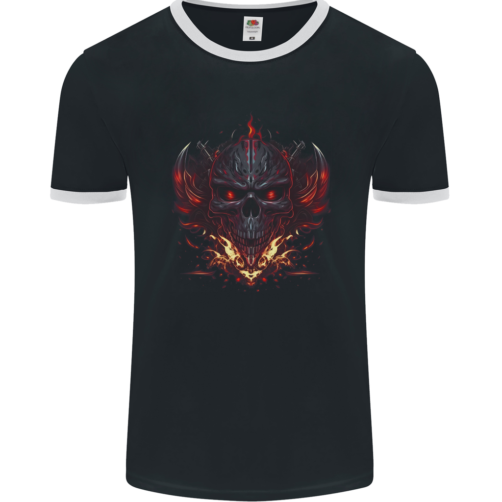 Embrace the darkness with a touch of style and attitude. Dare to be different, dare to be bold. Order your Evil Flame Skull Biker Fantasy Heavy Metal Men's Ringer T-Shirt by FotL today and unleash the untamed fire within.