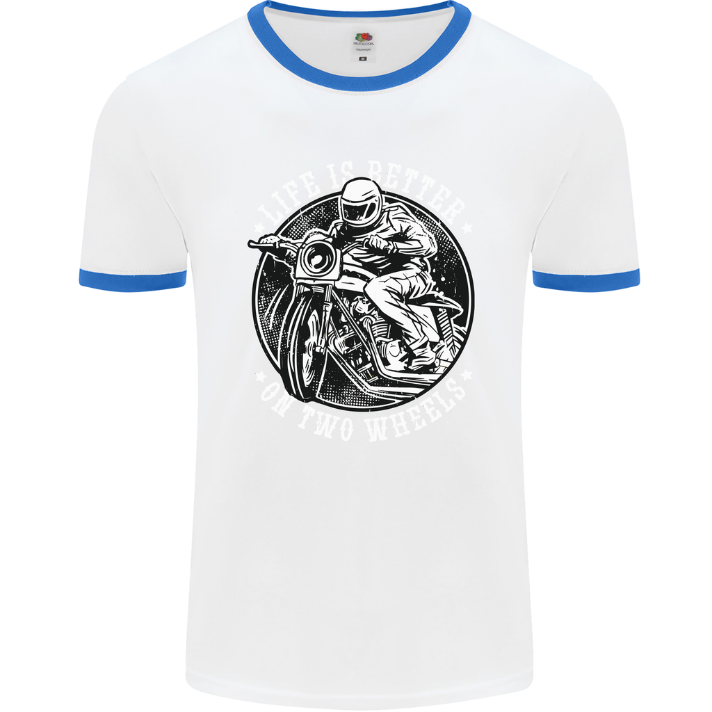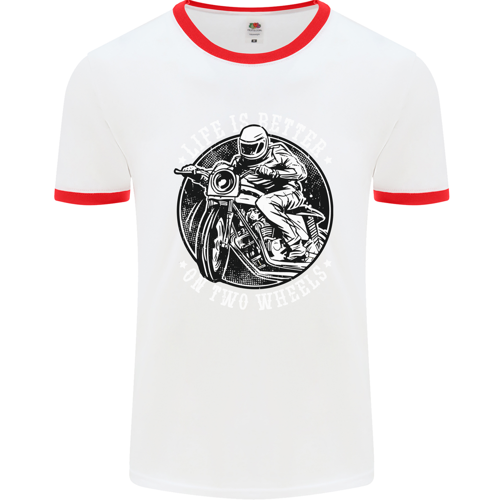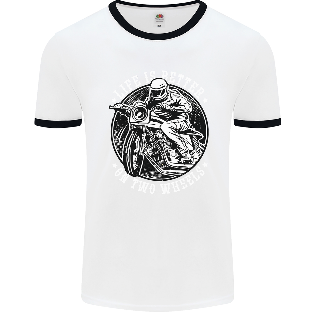 Welcome to the world of effortless style and comfort with our Life Is Better On Two Wheels Men's Ringer T-Shirt. This iconic tee is not just a piece of clothing; it's a statement of your passion for cycling and a celebration of the joy that comes from riding on two wheels.