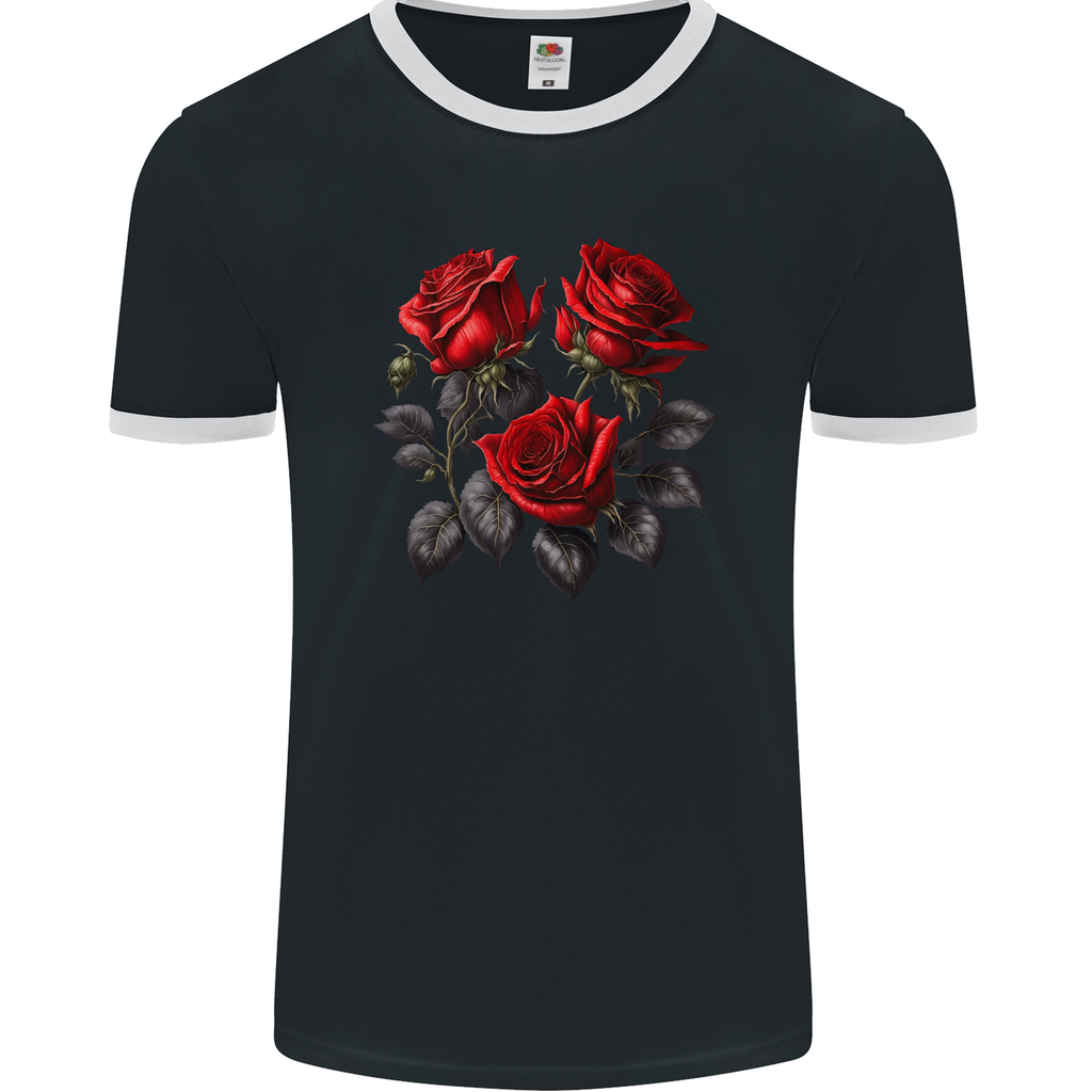 Stand out from the crowd and showcase your unique sense of style with our 3 Red Roses Mens Ringer T-Shirt. Embrace the dark side of fashion and make a bold statement with this must-have piece for any goth enthusiast or anyone looking to add a hint of darkness to their wardrobe.