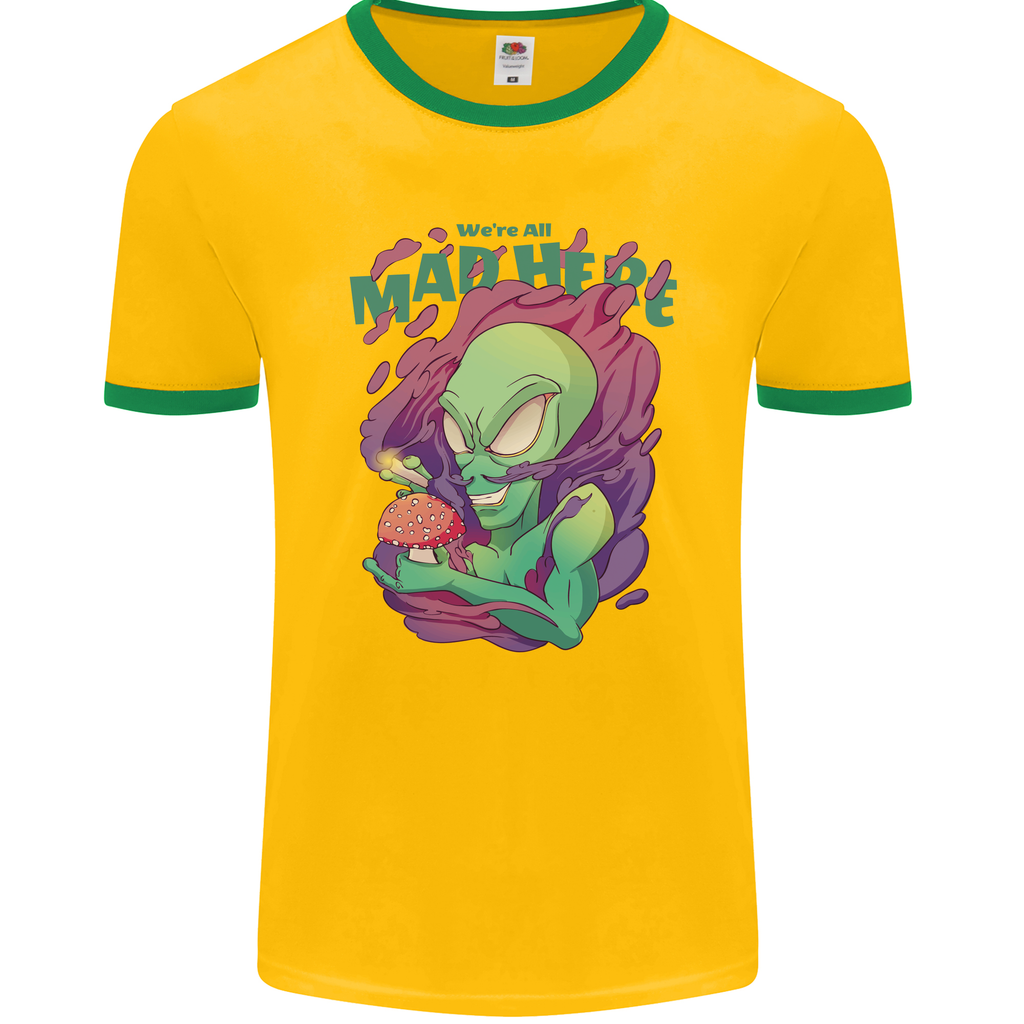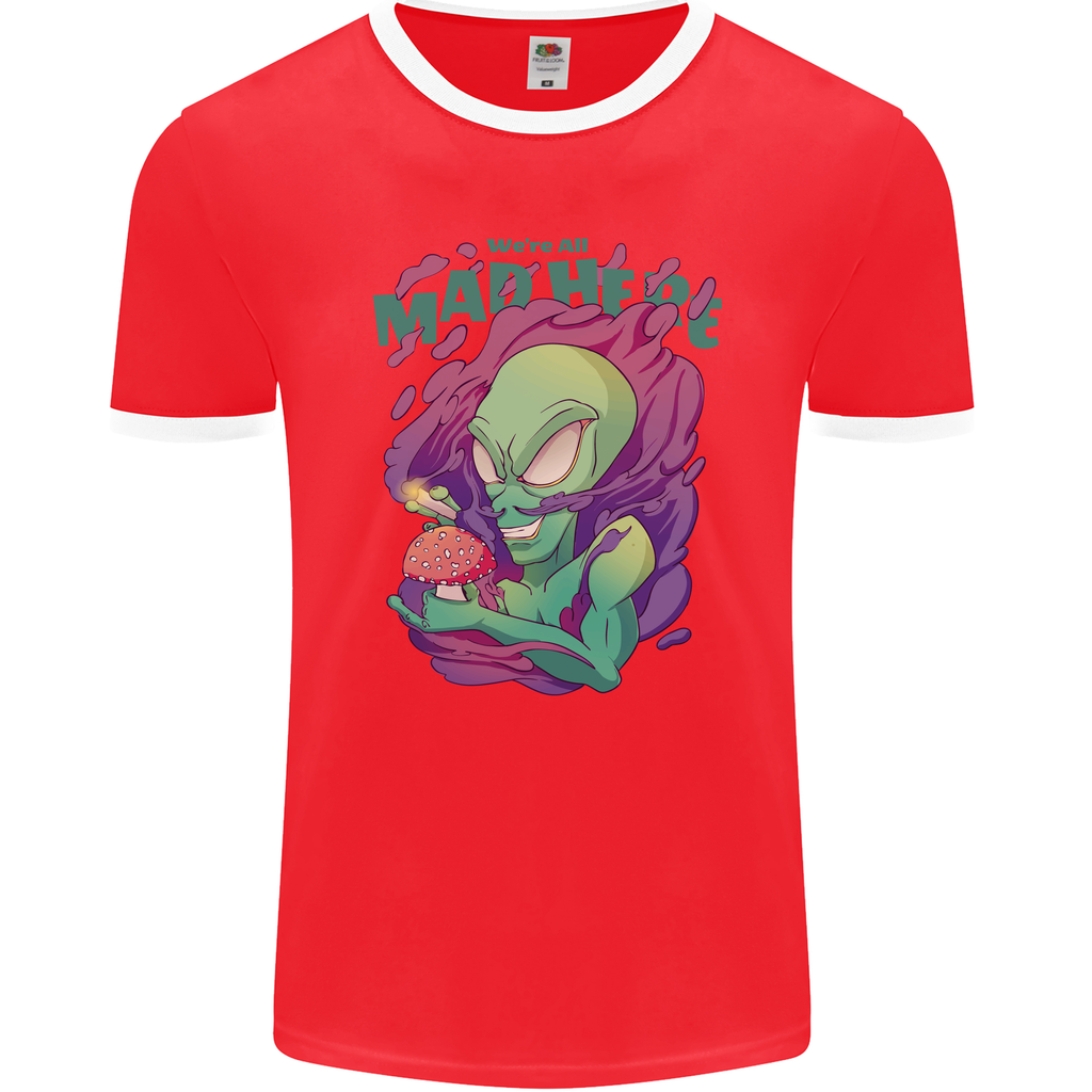Welcome to the whimsical world of magic mushrooms with the All Mad Here Alien Mens Ringer T-Shirt by FotL! This quirky and eye-catching T-shirt is a must-have for those who embrace the extraordinary and love to stand out from the crowd.