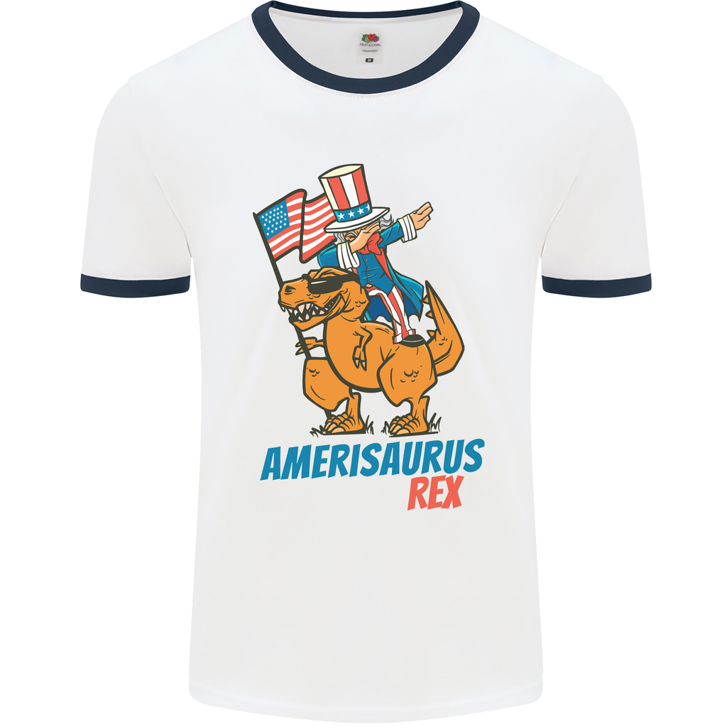 Let your style roar with confidence as you sport this eye-catching ringer t-shirt that features a bold and vibrant print of Amerisaurus doing the dab pose alongside Uncle Sam's signature look.