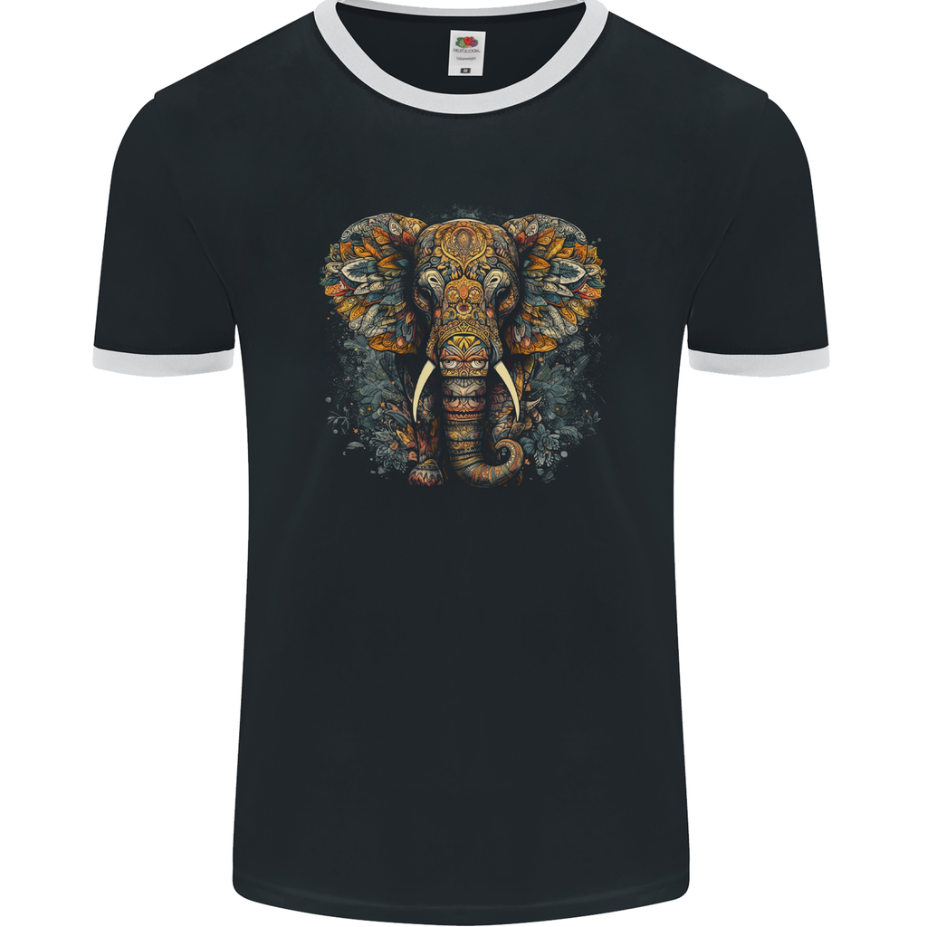 Experience the magic of traditional tribal art reimagined for the modern world with our Elephant With Tribal Markings Men's Ringer T-Shirt. Make a bold fashion statement and celebrate cultural diversity with every wear.