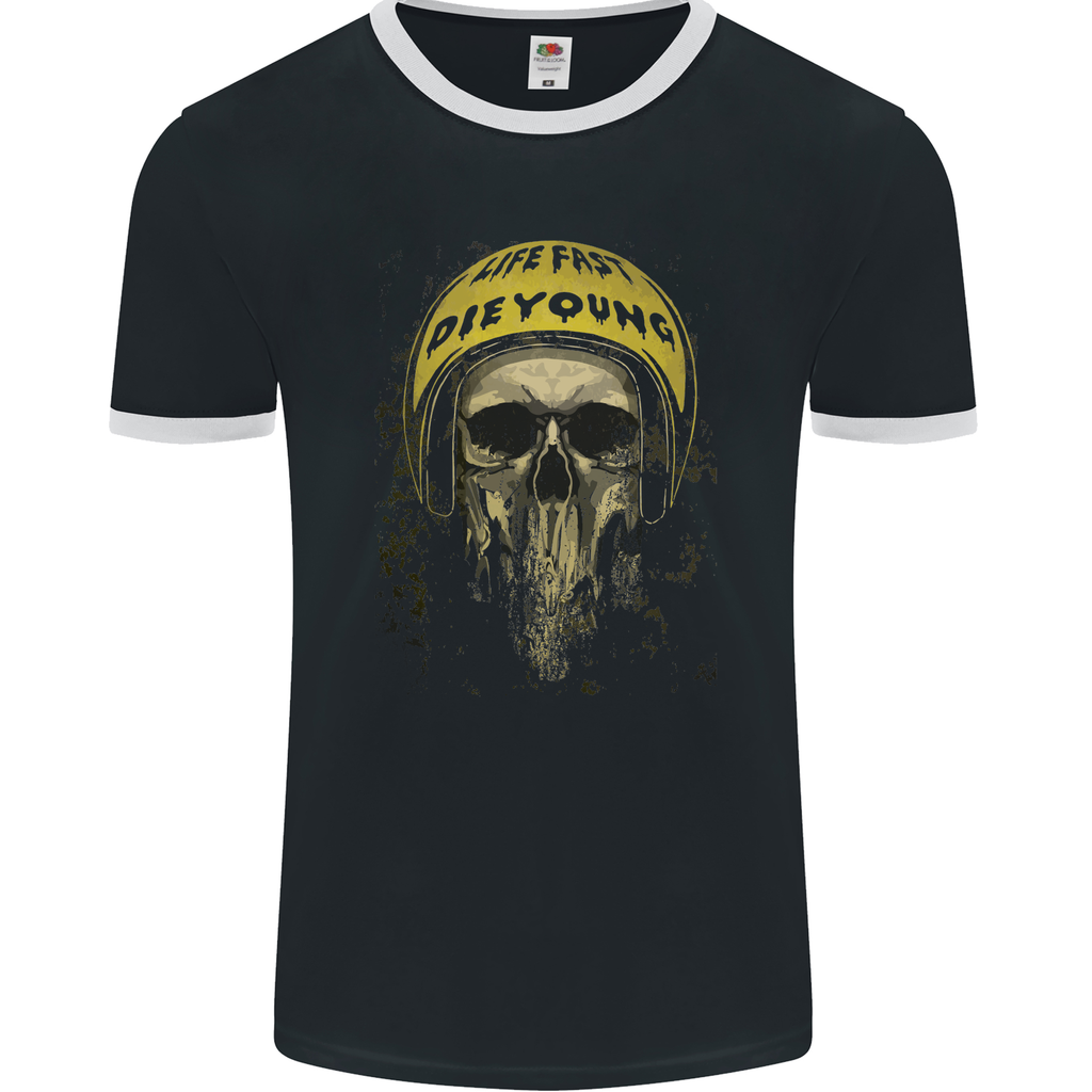 Indulge in the rebellious spirit of the open road with the Live Fast Die Young Biker Skull Motorcycle Mens Ringer T-Shirt by FotL. This edgy yet stylish tee is designed for those who live life on the fast lane and embrace the thrill of two-wheeled adventures with a fearless attitude.