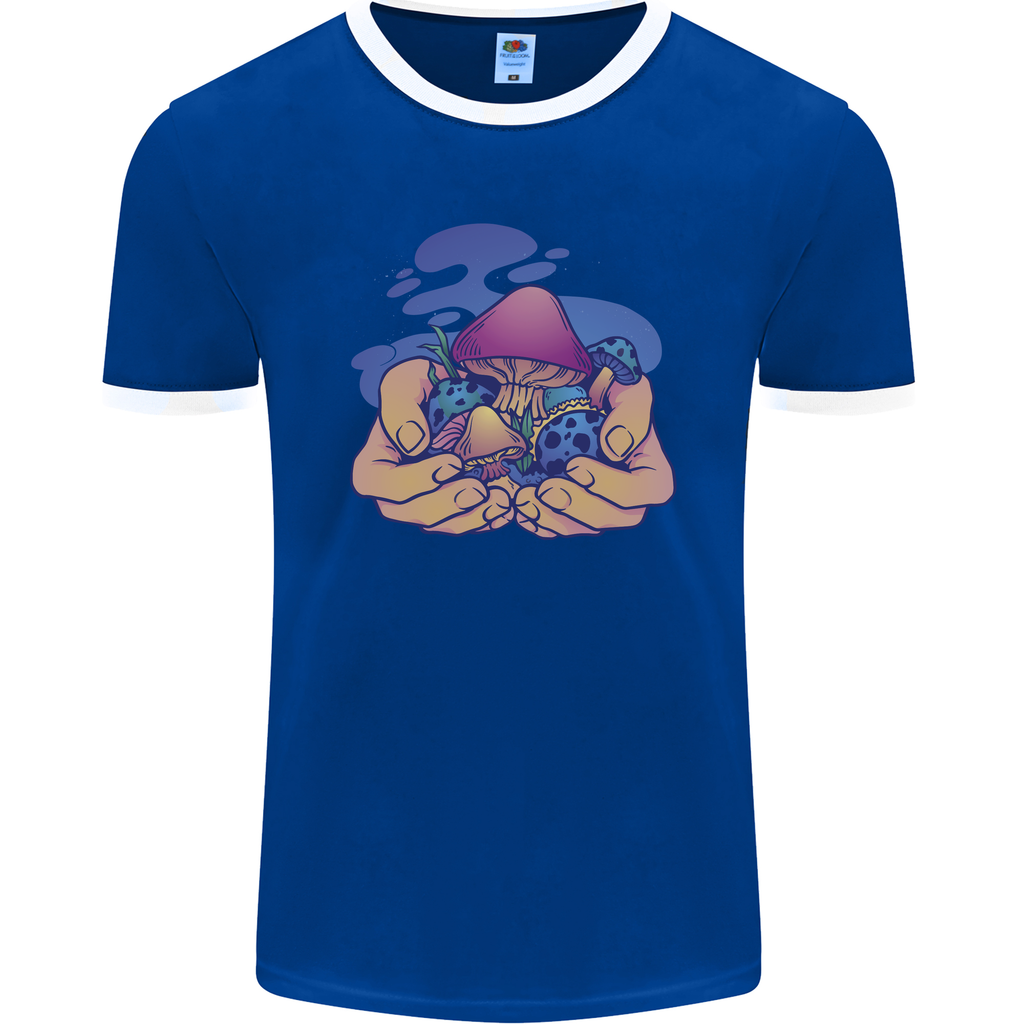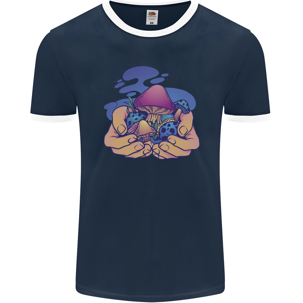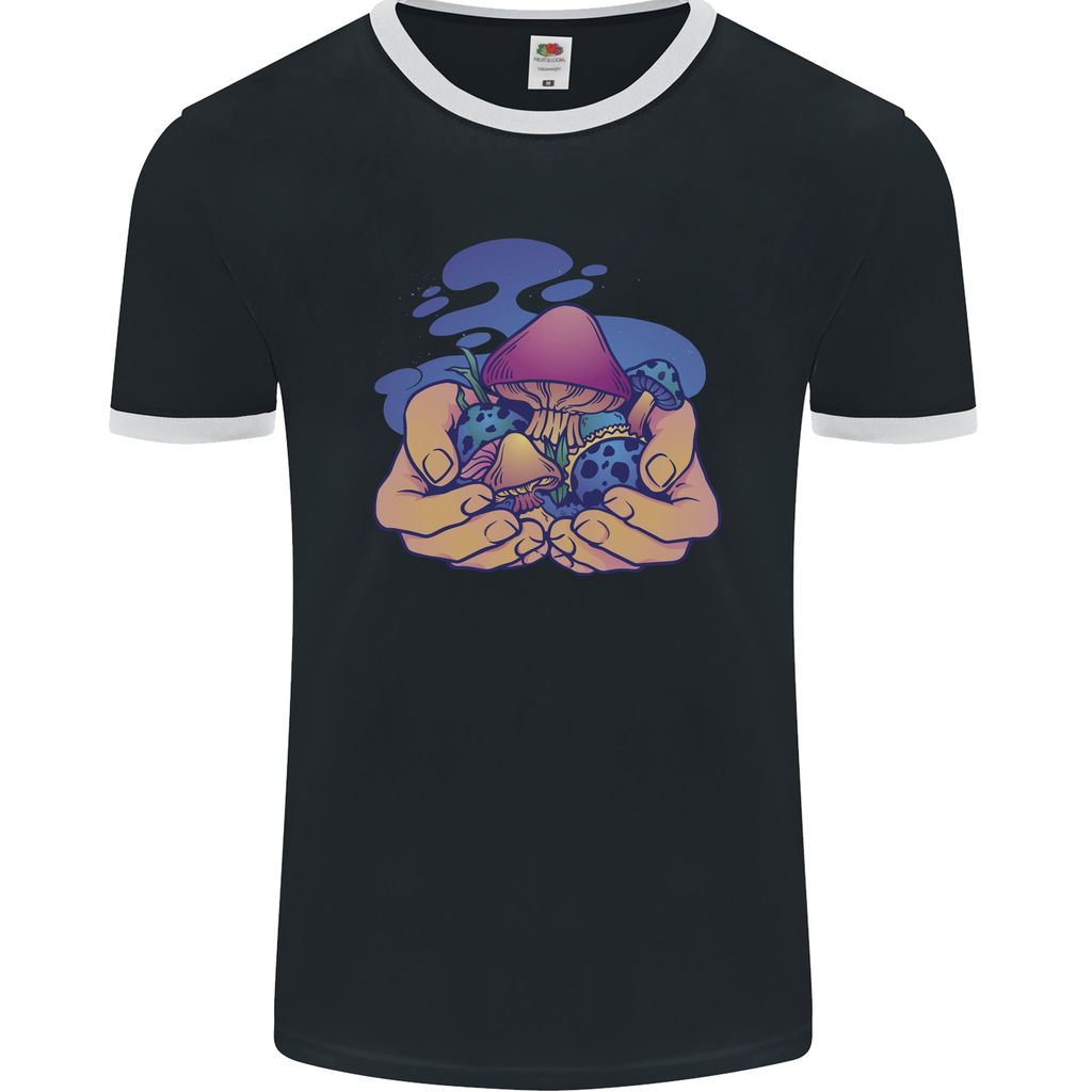 Welcome to a world where fashion meets mycology with our exclusive Magic Mushroom Hands Mens Ringer T-Shirt by FotL. This unique and trippy design is a must-have for those who appreciate both art and nature in a single garment.
