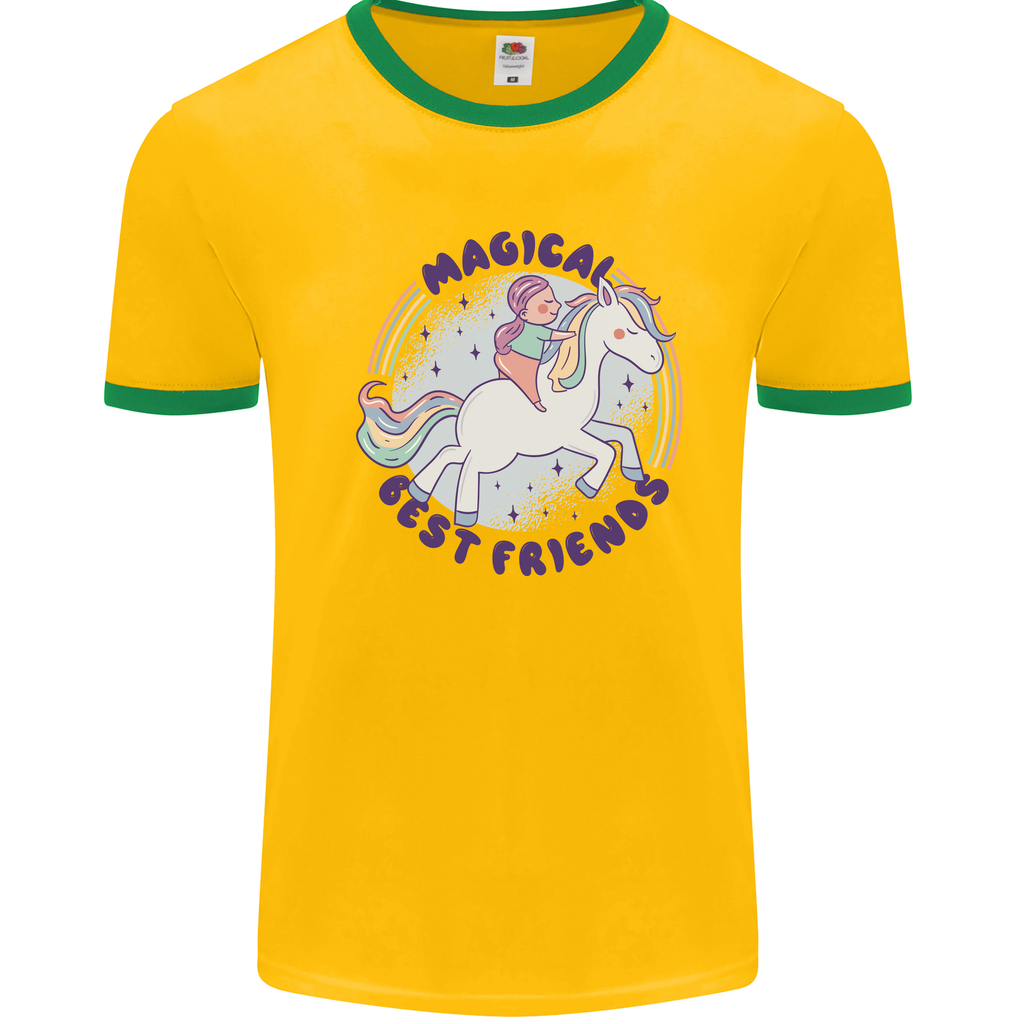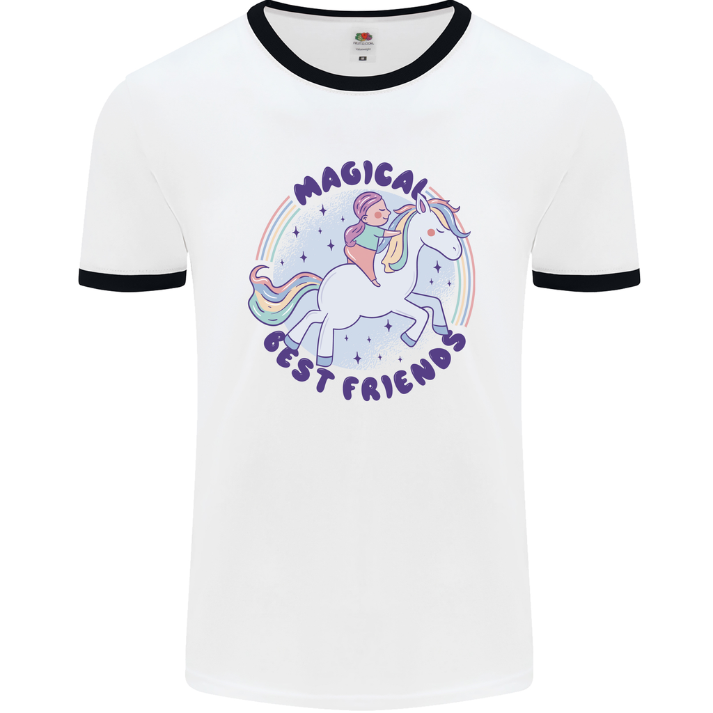 Welcome to the enchanting world of Magical Friends where dreams come alive and fantasies take flight. This Men's Ringer T-Shirt features a delightful illustration of a young girl riding a majestic unicorn, capturing the essence of wonder and adventure.