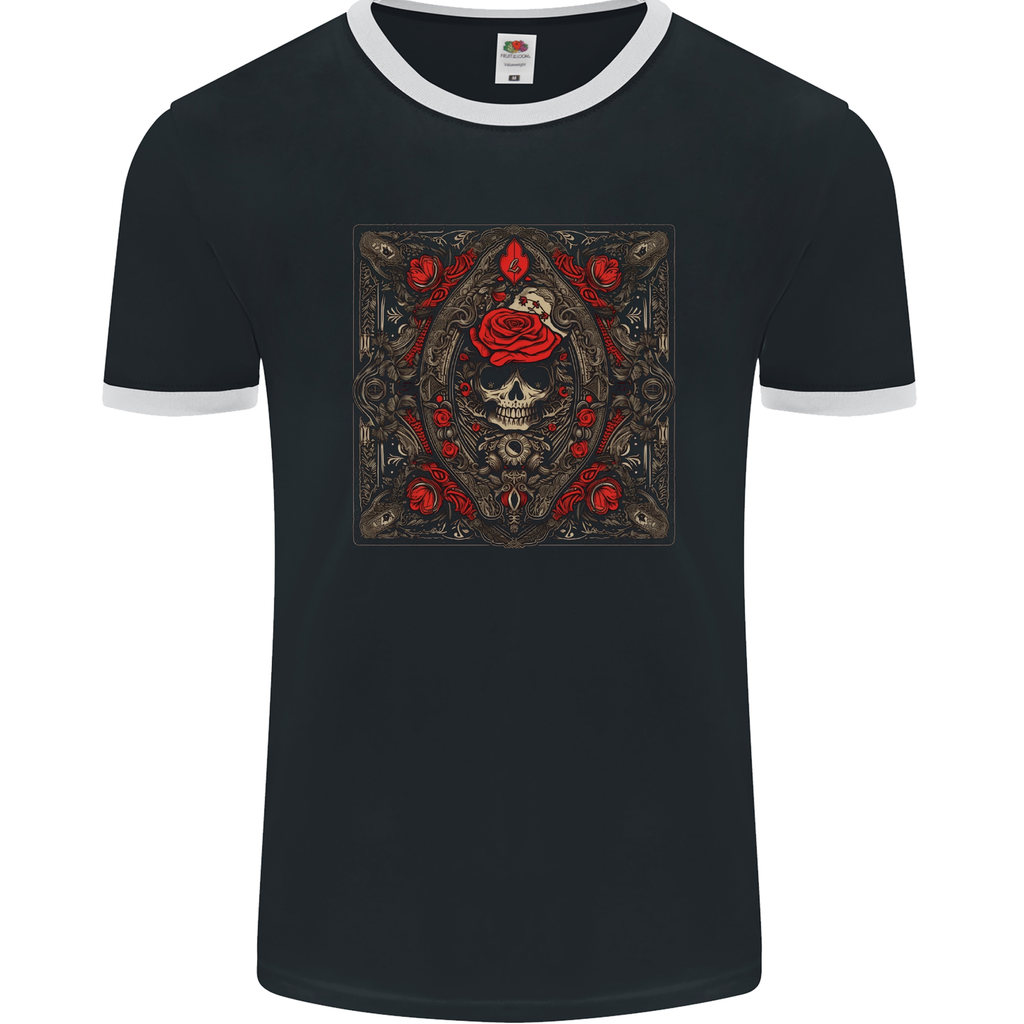 Don't settle for ordinary when you can have extraordinary. Elevate your wardrobe with our Ornate Playing Card Skull Goth Gothic Mens Ringer T-Shirt FotL and let your style speak volumes. Unleash your inner goth and make a statement wherever you go.