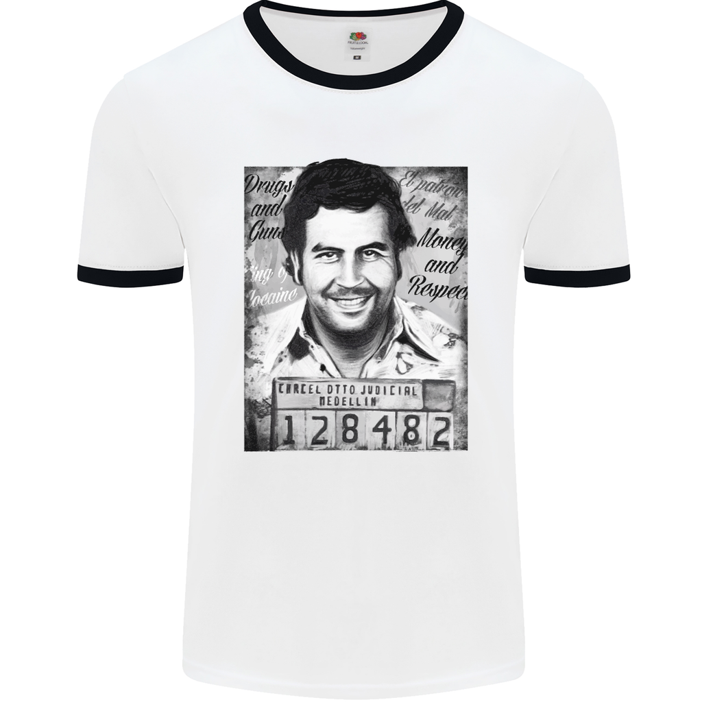 Featuring a bold and striking mug shot of Pablo Escobar, this ringer t-shirt pays homage to the legendary drug lord's infamous persona. The contrasting neckline and sleeve trims give this tee a classic ringer style, perfect for those who appreciate a touch of nostalgia in their wardrobe.
