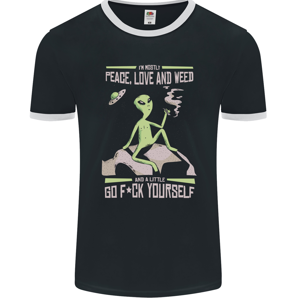 Featuring a timeless black and white colour scheme with a striking graphic print, this t-shirt is a versatile addition to your wardrobe that pairs effortlessly with jeans, shorts, or joggers. Let your style speak for itself and show the world what you stand for with our Peace Love Weed Men's Ringer T-Shirt.