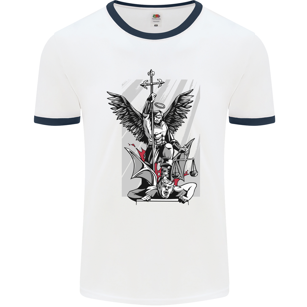 Embrace style and faith with our St Michael Killing the Devil Christian God Mens Ringer T-Shirt. This unique and eye-catching shirt is perfect for those who want to express their religious beliefs in a bold and fashionable way.