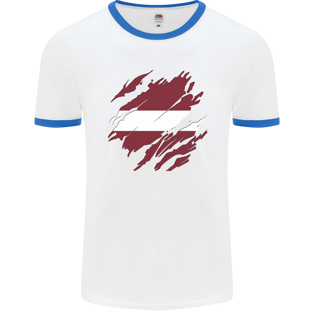 Welcome to the vibrant world of Latvian pride with our Torn Latvia Flag Latvian Day Football Mens Ringer T-Shirt. This striking ringer tee is a celebration of the spirit of Latvia, combining sporty style with cultural heritage.