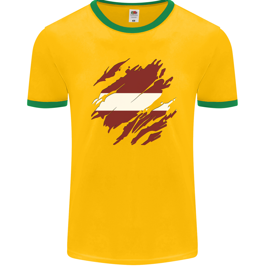 Welcome to our exclusive collection featuring the Torn Latvia Flag Latvian Day Football Men's Ringer T-Shirt by FotL. Show off your Latvian pride with this stylish and comfortable t-shirt that combines patriotism with sporty flair.