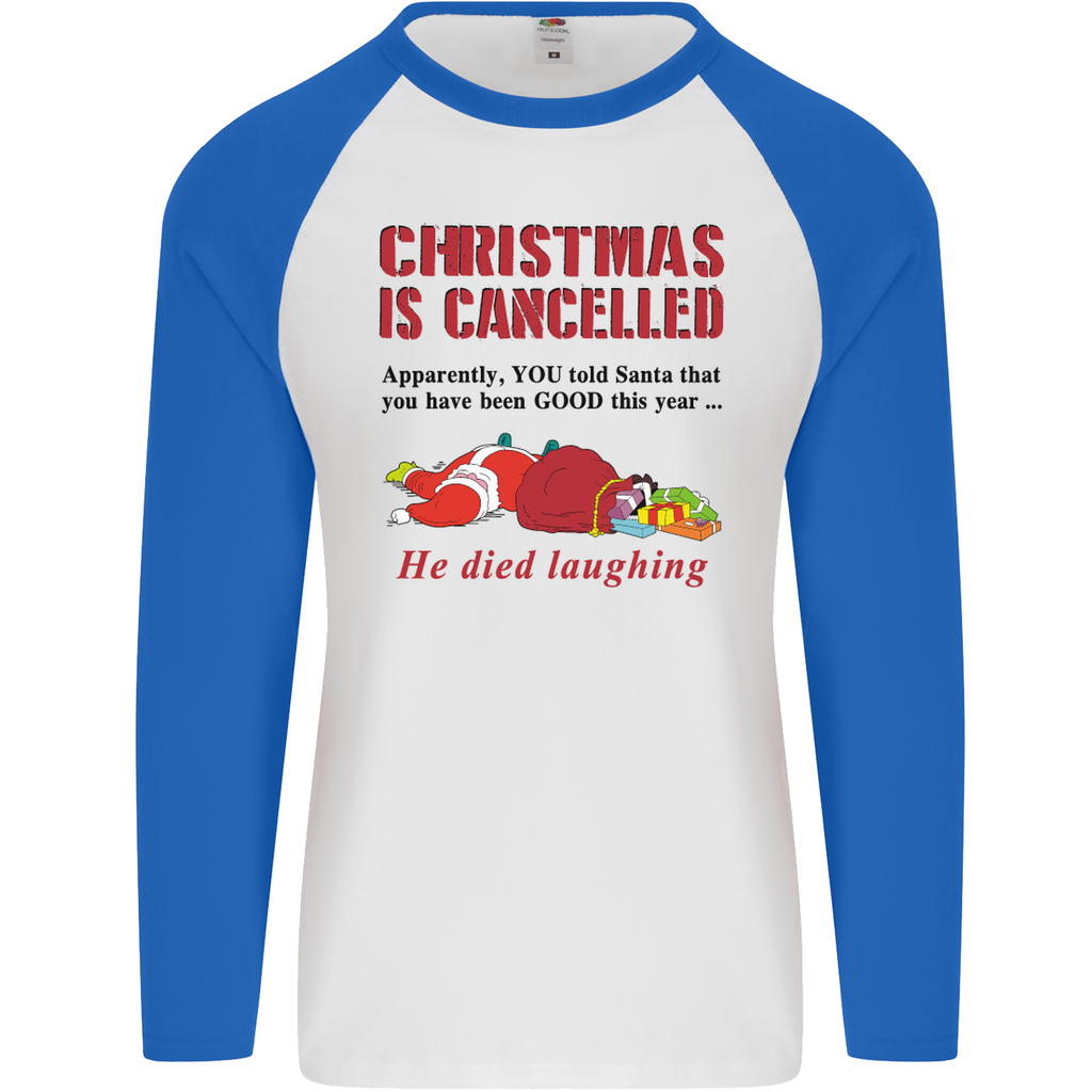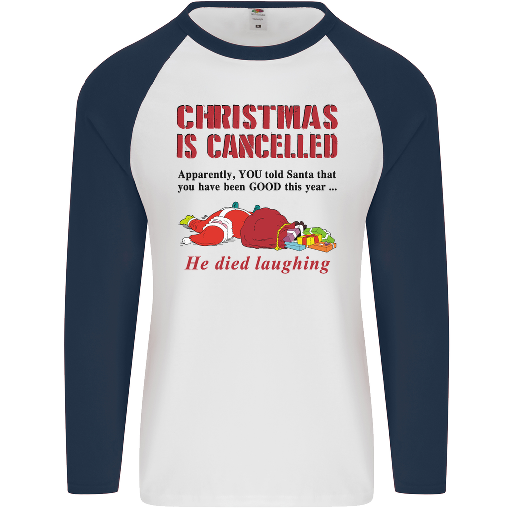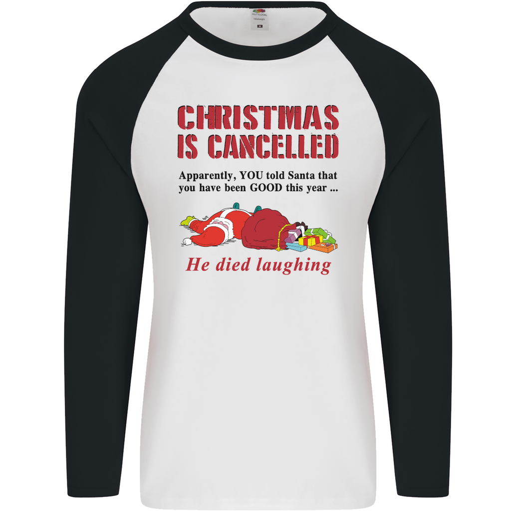 Embrace the lighter side of the holiday season with the "Christmas Is Cancelled" Funny Santa Claus Men's Long Sleeve Baseball T-Shirt. Order yours today and let the laughter begin!