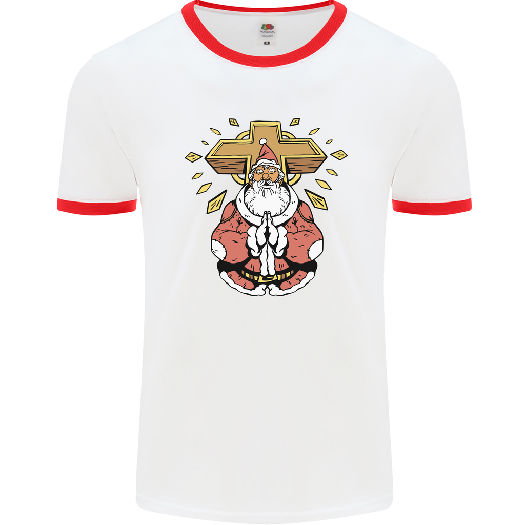 Designed for comfort and style, the Christmas Praying Santa T-Shirt is made from high-quality, breathable cotton. It features a classic ringer style with contrasting collar and sleeve accents, making it a versatile addition to your festive wardrobe. Whether you're attending a family gathering, a church service, or simply enjoying a cosy day at home, this shirt offers a stylish way to express your beliefs while feeling comfortable.