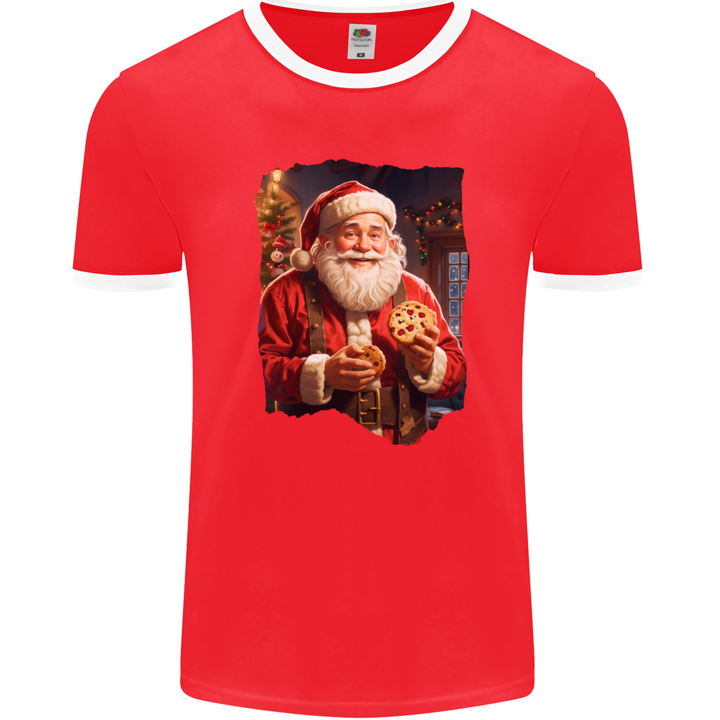 Crafted from high-quality materials, this ringer t-shirt showcases a delightful graphic featuring Santa Claus with his iconic red suit and a plate of cookies. It captures the magic of Christmas and immediately spreads cheer wherever you go. Whether you're attending a holiday party, decorating the tree, or enjoying a cosy night in, this t-shirt is sure to make a statement.