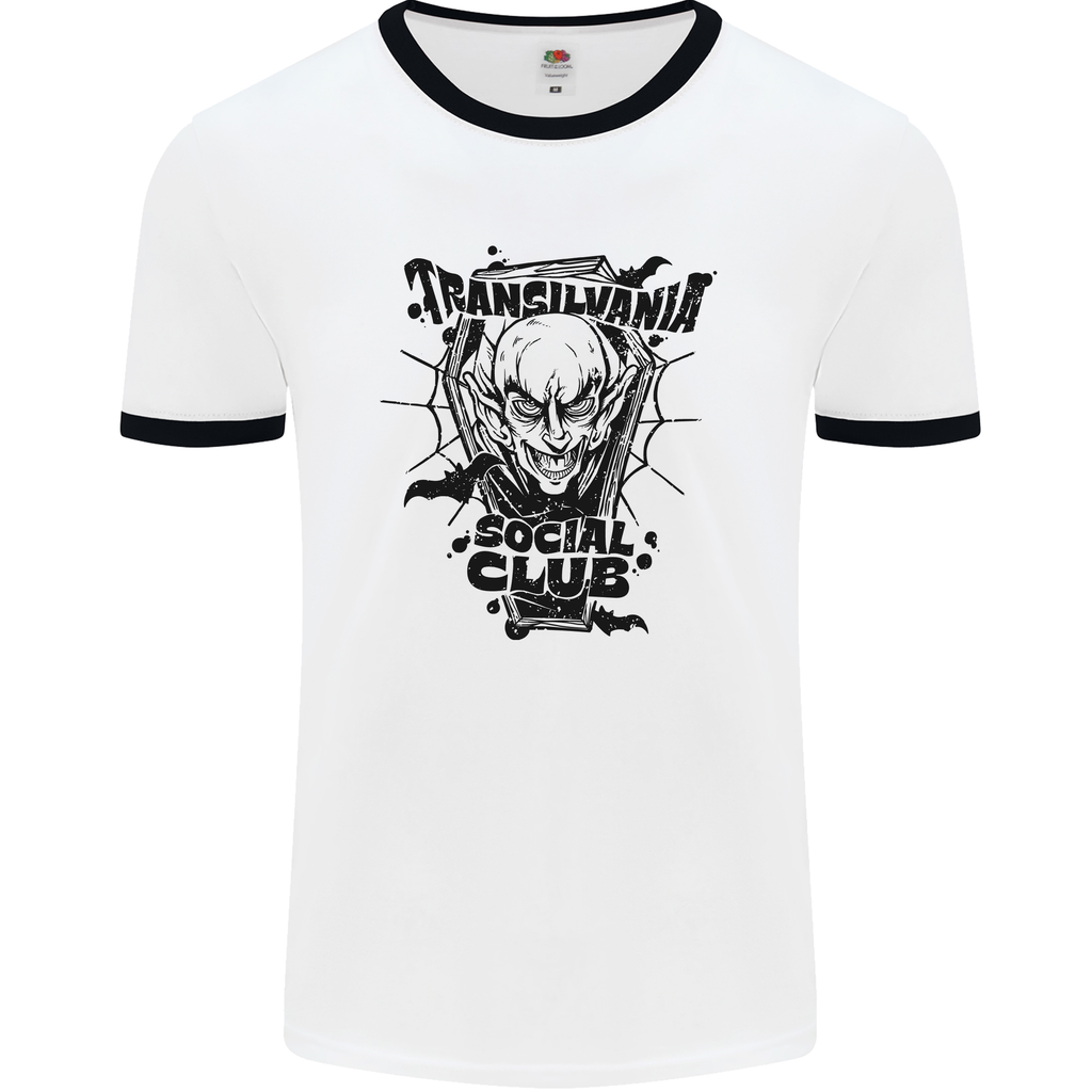 Welcome to the world of the Vampires Transylvania Social Club Halloween Men's Ringer T-Shirt! Embrace the spooky season with style and attitude as you level up your Halloween wardrobe with this unique piece.