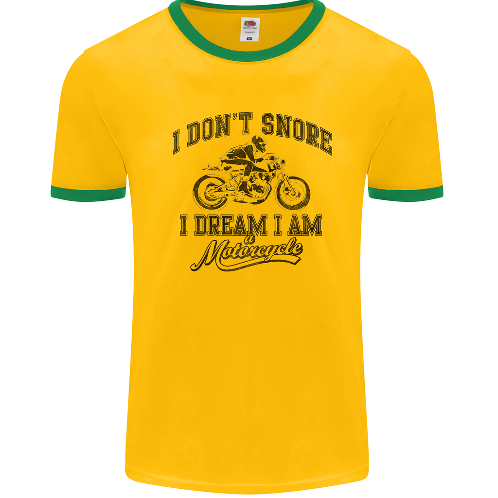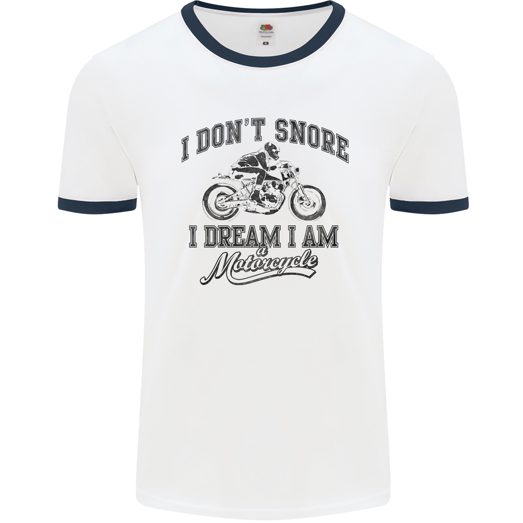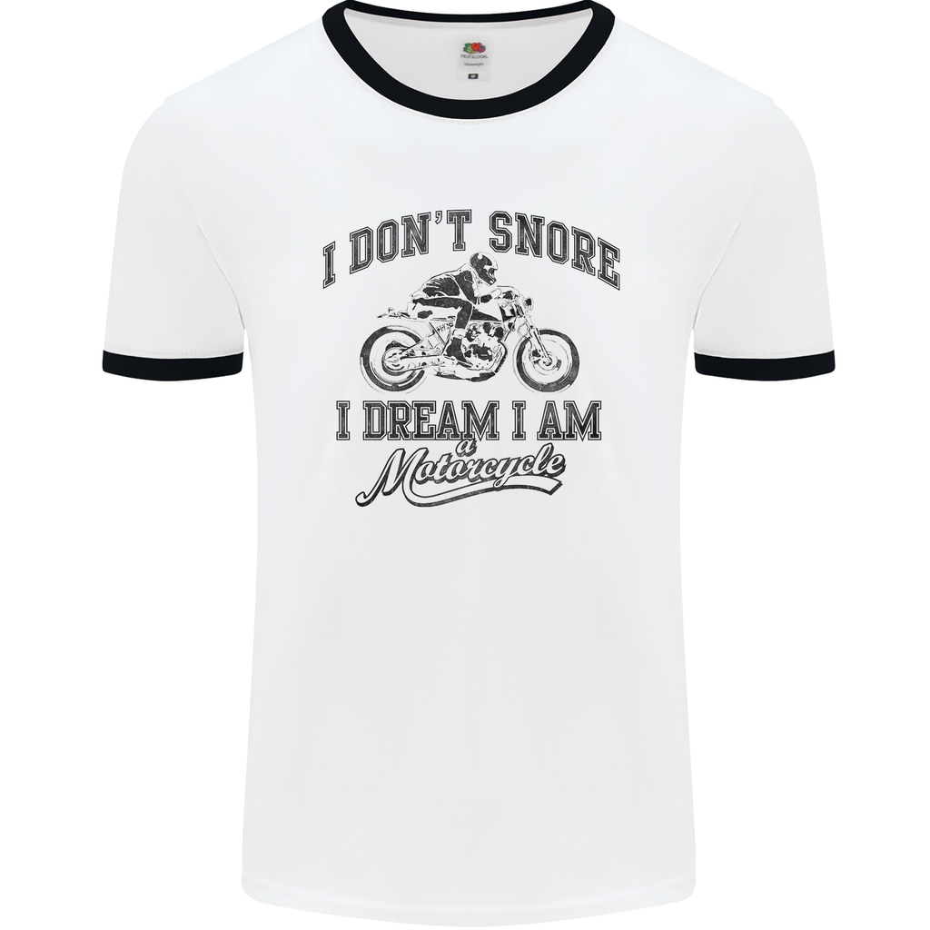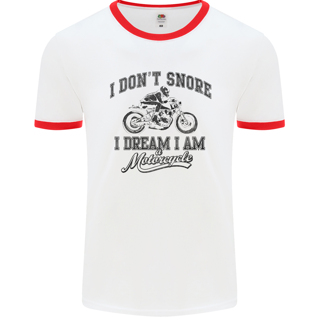 Express your love for motorcycles and let your sense of humour shine with the "I Don't Snore" Motorbike Biker Motorcycle Men's Ringer T-Shirt. Embrace the biker spirit and make a statement wherever you go!