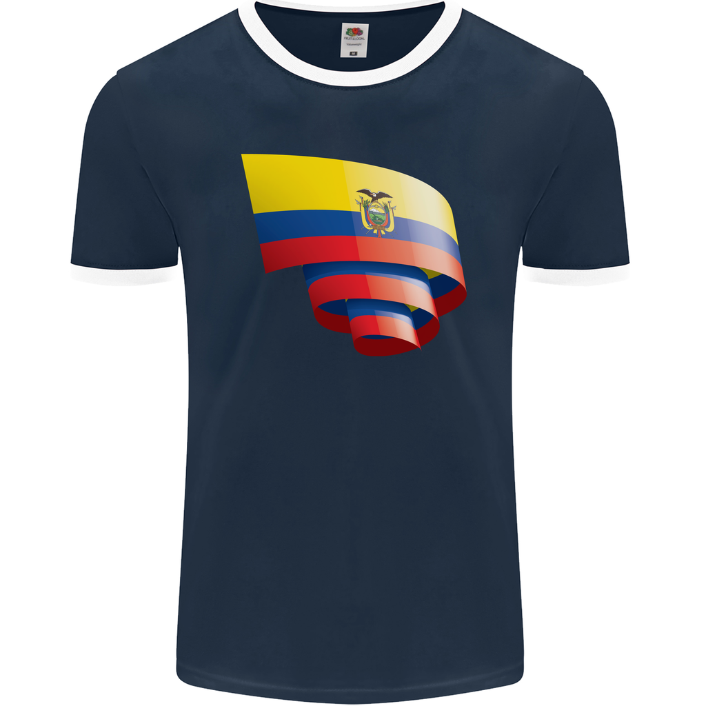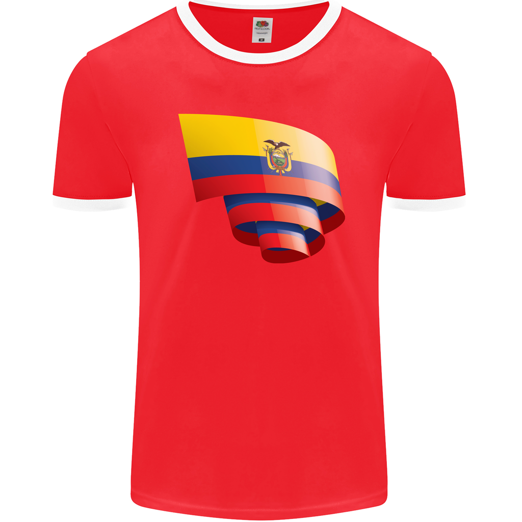Join the community of passionate football fans and proudly wear your allegiance with the Curled Ecuador Flag Ecuadorian Day Football Mens Ringer T-Shirt by FotL.