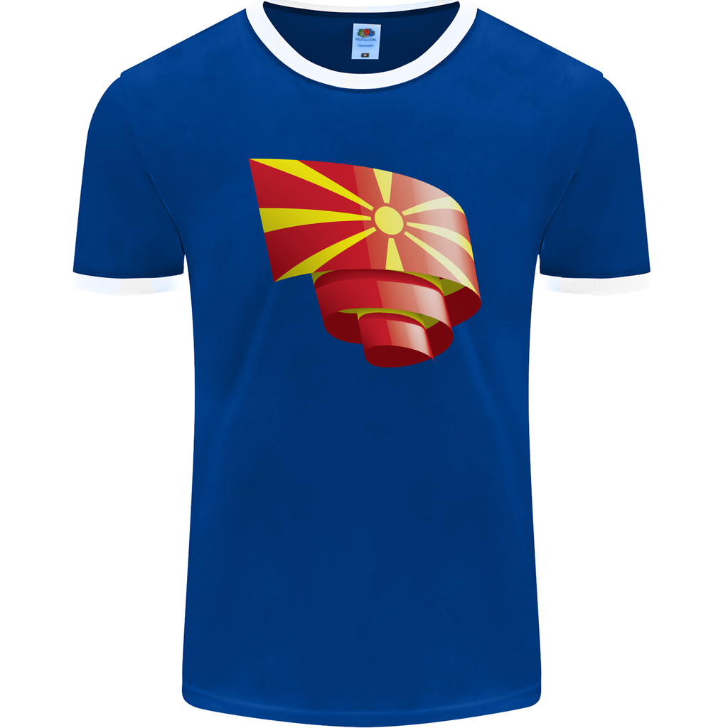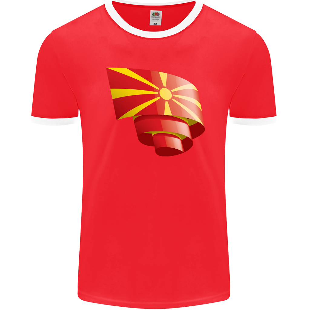 Welcome to the epitome of Macedonian pride and football passion with the Curled Macedonia Flag Macedonian Day Football Mens Ringer T-Shirt by FotL.