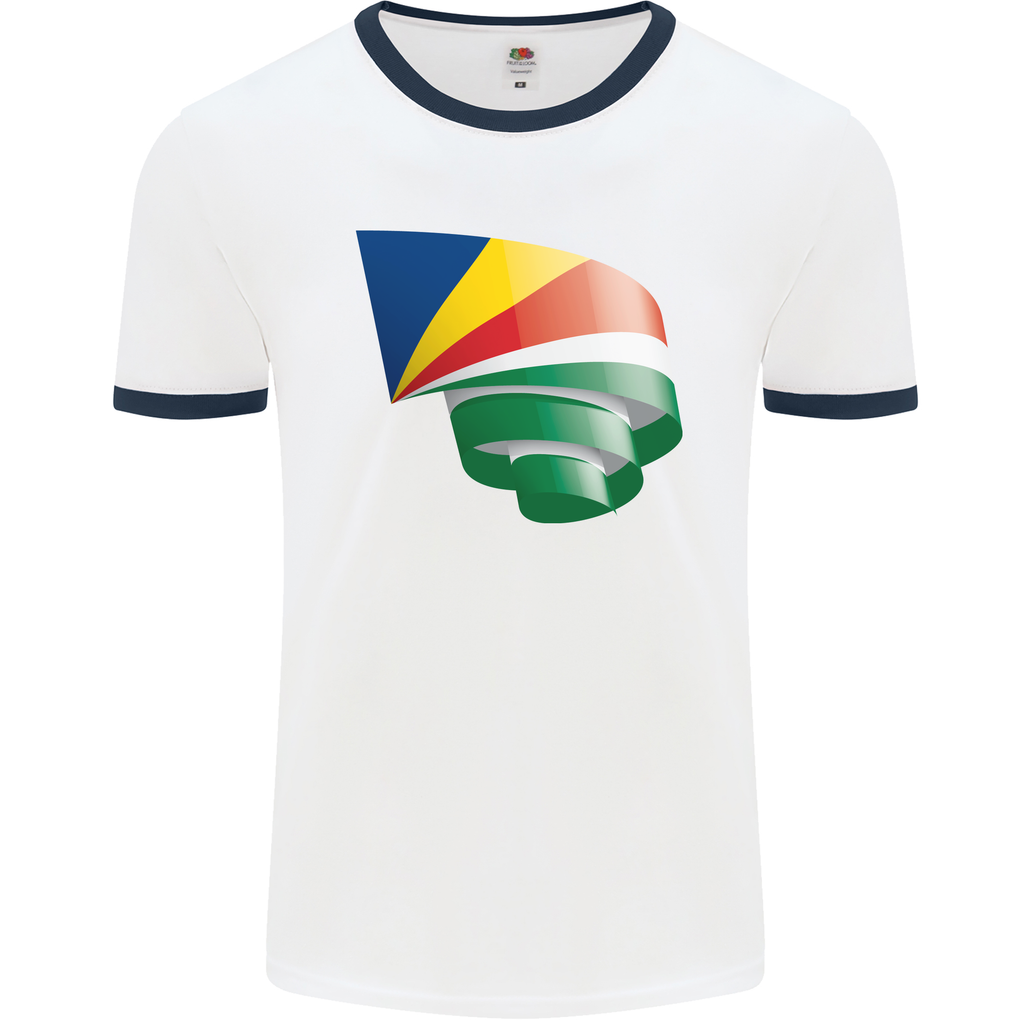 This Curled Seychelles Flag Seychellois Day Football Men's Ringer T-Shirt is the embodiment of national pride and sporty style. Celebrate Seychellois spirit with this unique and trendy shirt that is perfect for casual outings or supporting your favorite team.