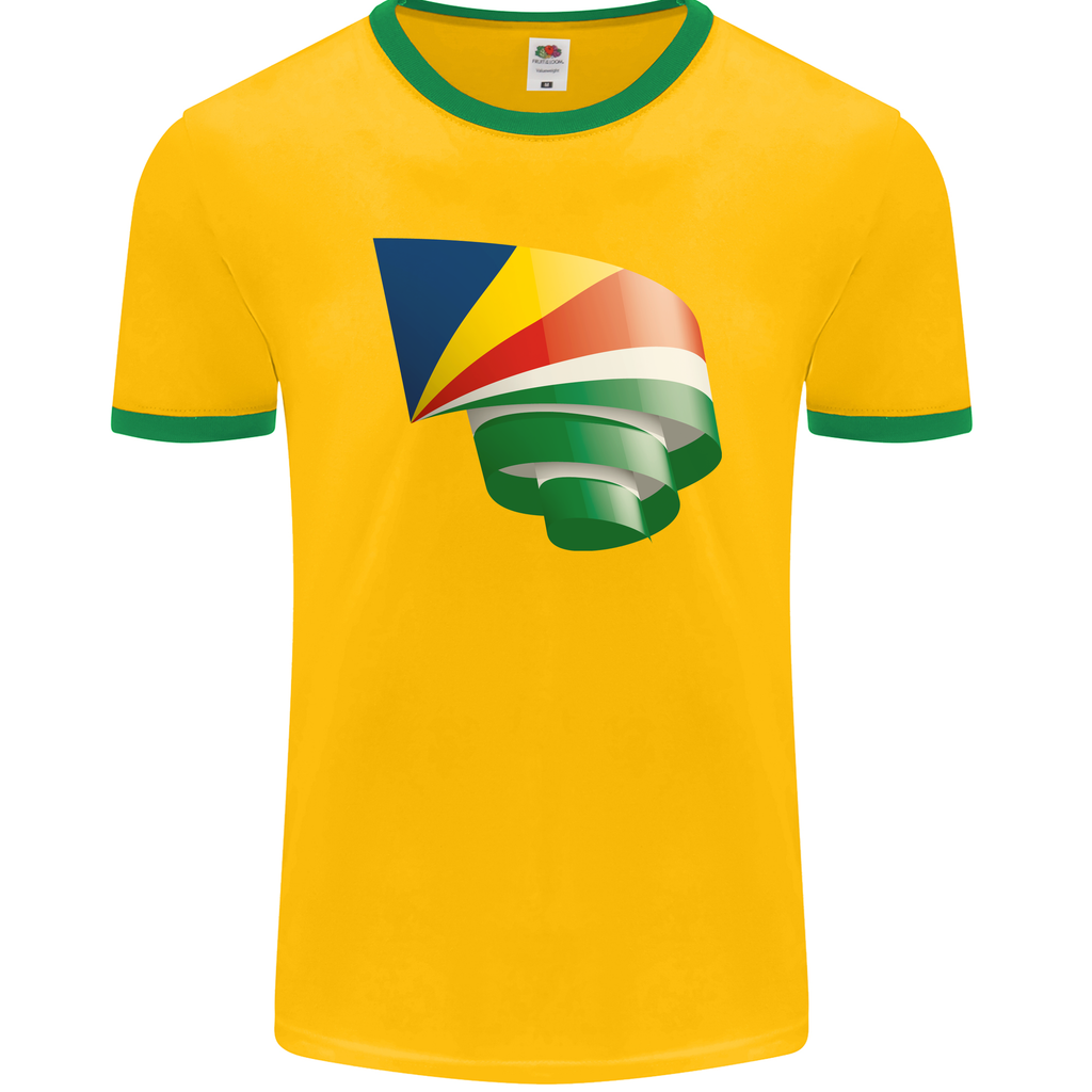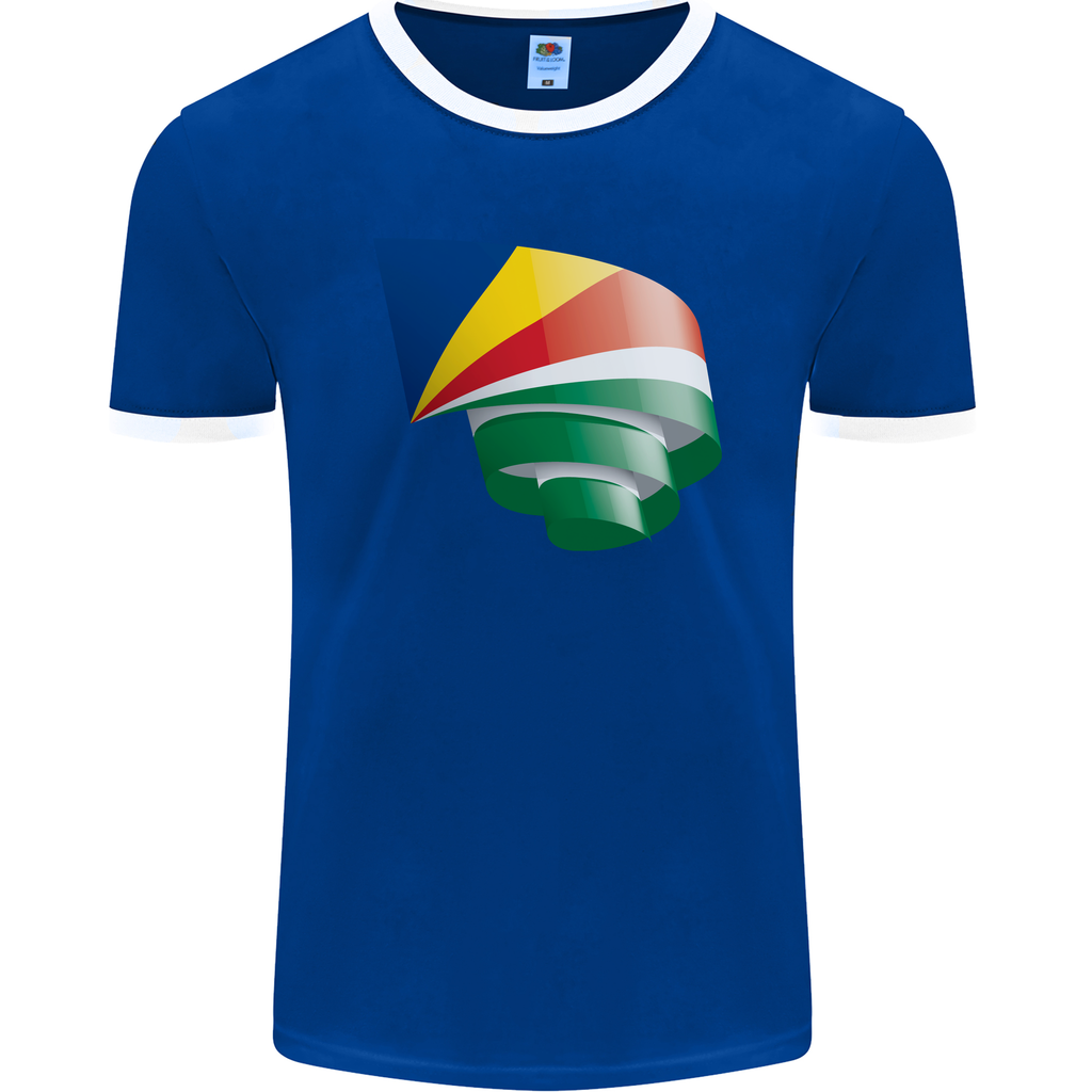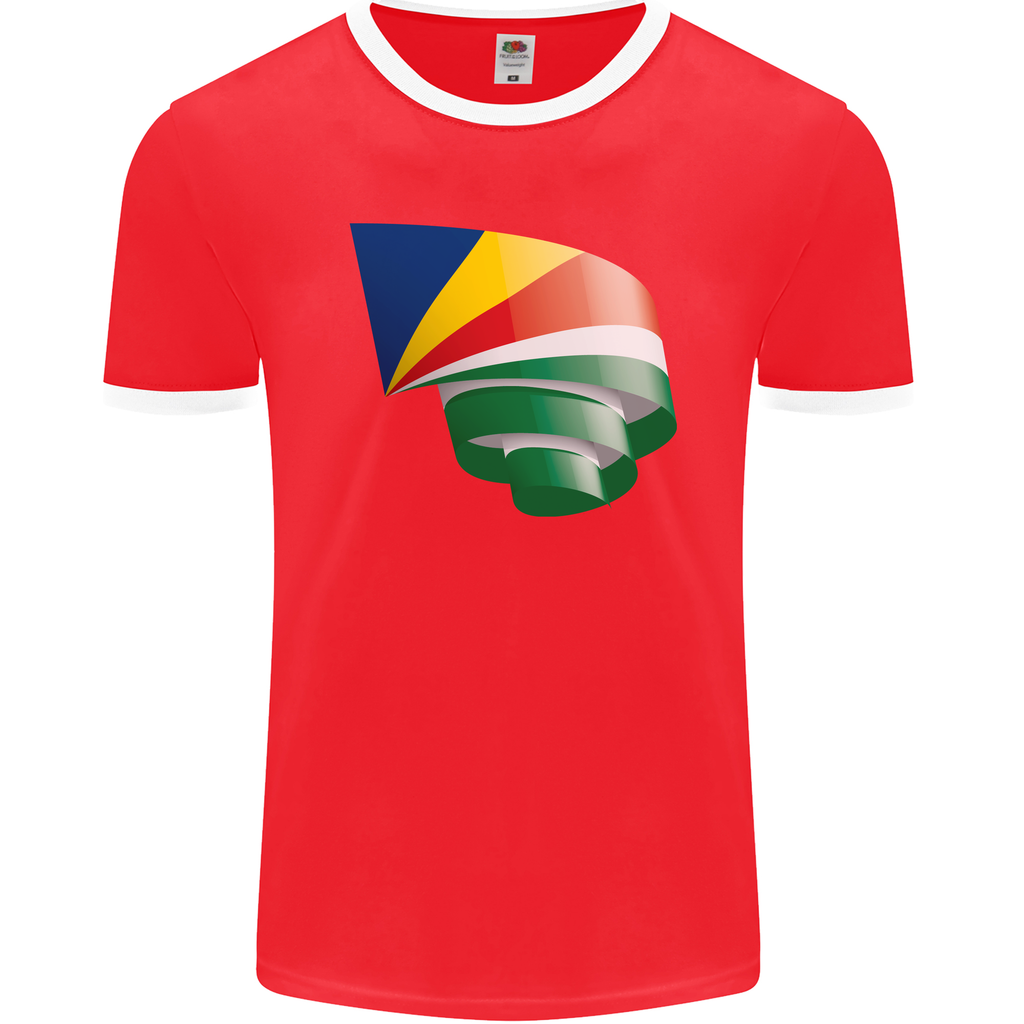 Welcome to the vibrant world of the Curled Seychelles Flag Seychellois Day Football Mens Ringer T-Shirt by FotL. This extraordinary piece encapsulates the spirit of the Seychelles with a unique twist - perfect for anyone who takes pride in their Seychellois identity.