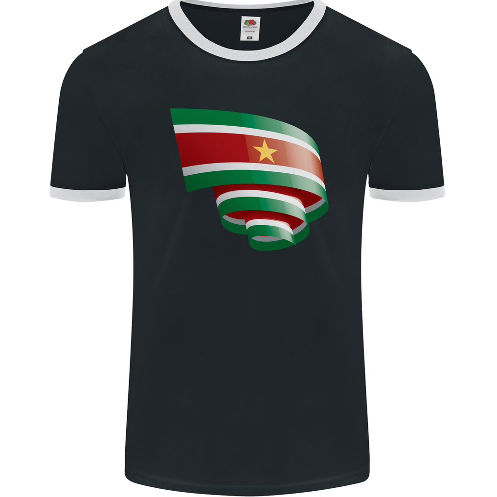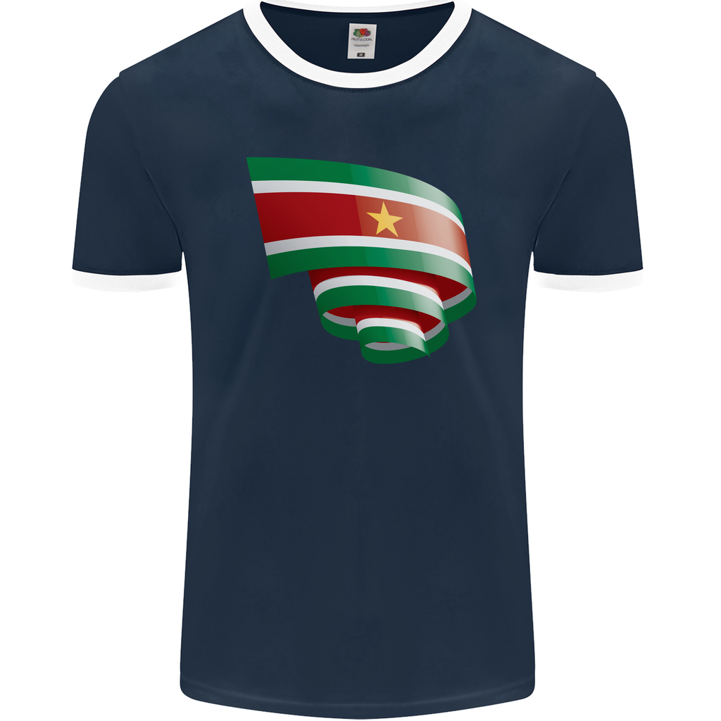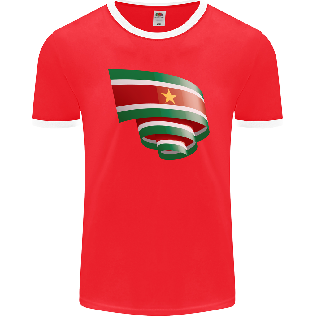 Welcome to the celebration of Suriname Day in style with our Curled Suriname Flag Football Men's Ringer T-Shirt FotL! This unique shirt is designed to bring out your patriotic spirit while keeping you comfortable and fashionable.