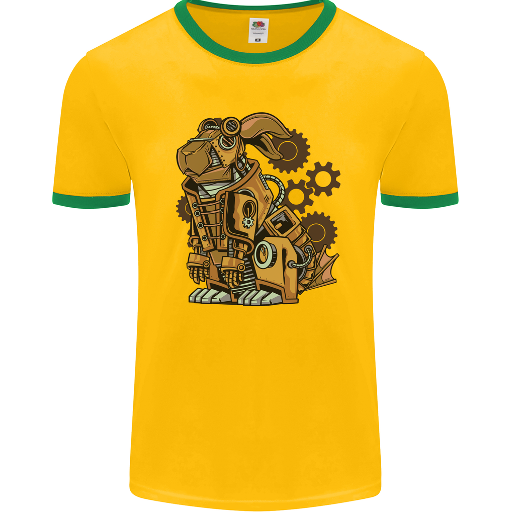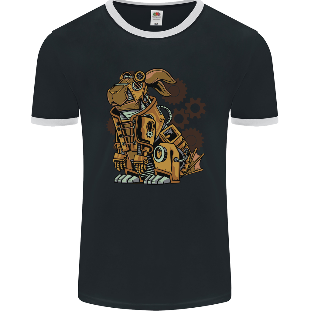 Add a touch of eccentricity to your wardrobe with this ringer t-shirt featuring a bold and intricate design of a steampunk rabbit. The contrast of the ringer style neckline and sleeves adds a retro flair, making it a versatile piece that can be dressed up or down for any occasion.