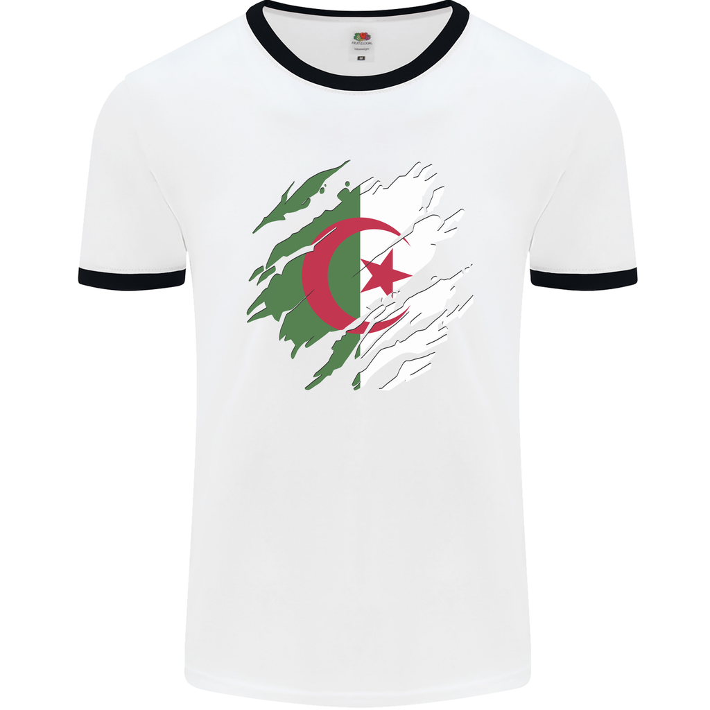 Designed with quality and style in mind, this shirt features a bold graphic of a torn Algerian flag, symbolizing resilience and strength. The contrast ringer neck and sleeve trims add a sporty touch, making it a versatile piece for everyday wear or game day excitement.