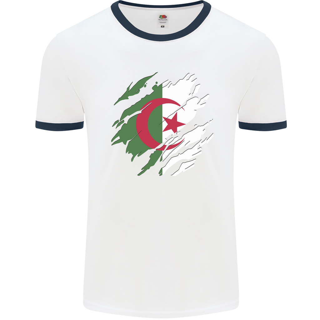 Embrace your Algerian pride with the Torn Algeria Flag Algerian Day Football Men's Ringer T-Shirt. This dynamic and expressive shirt is a must-have for any football fan celebrating Algerian Day or showing support for Algeria's national team.