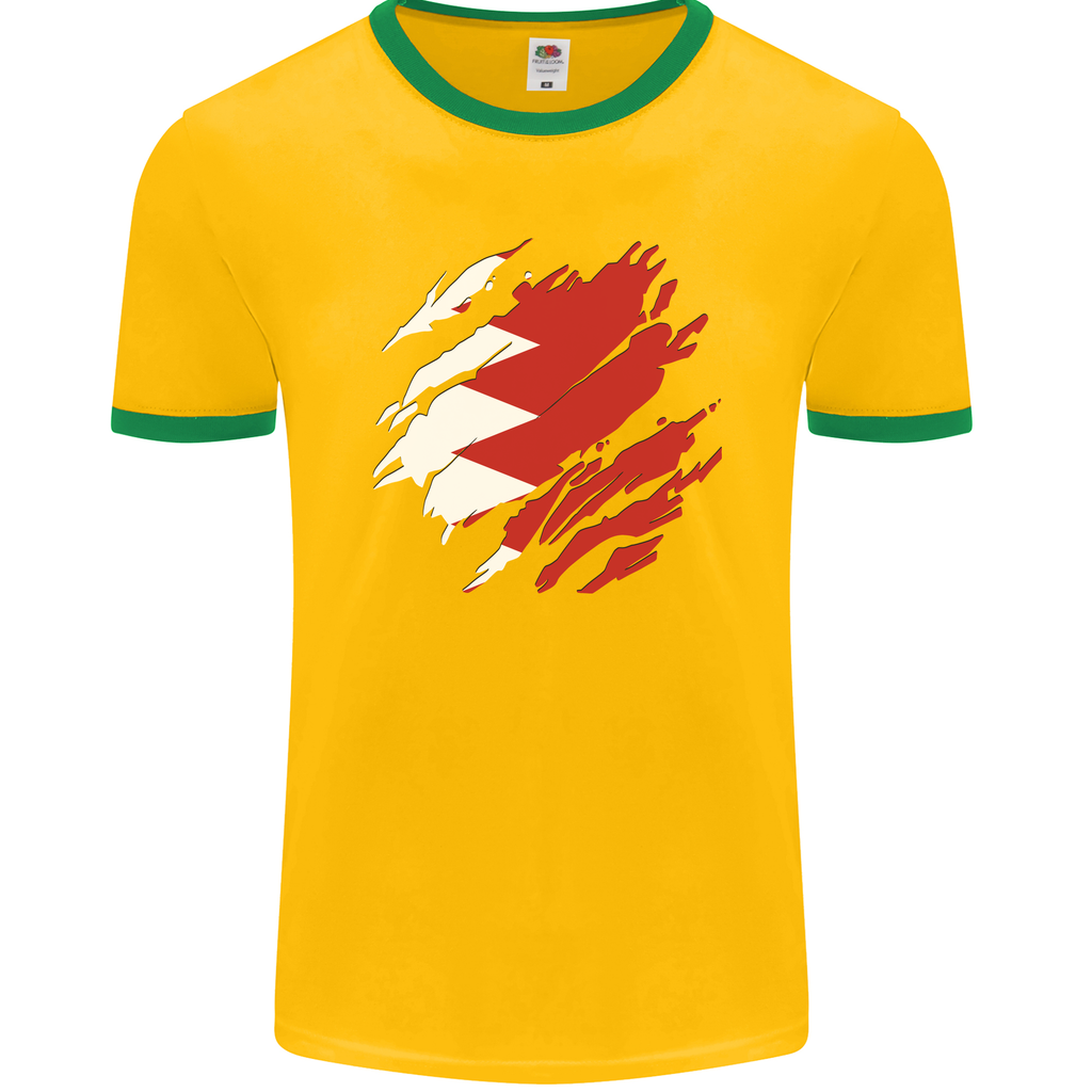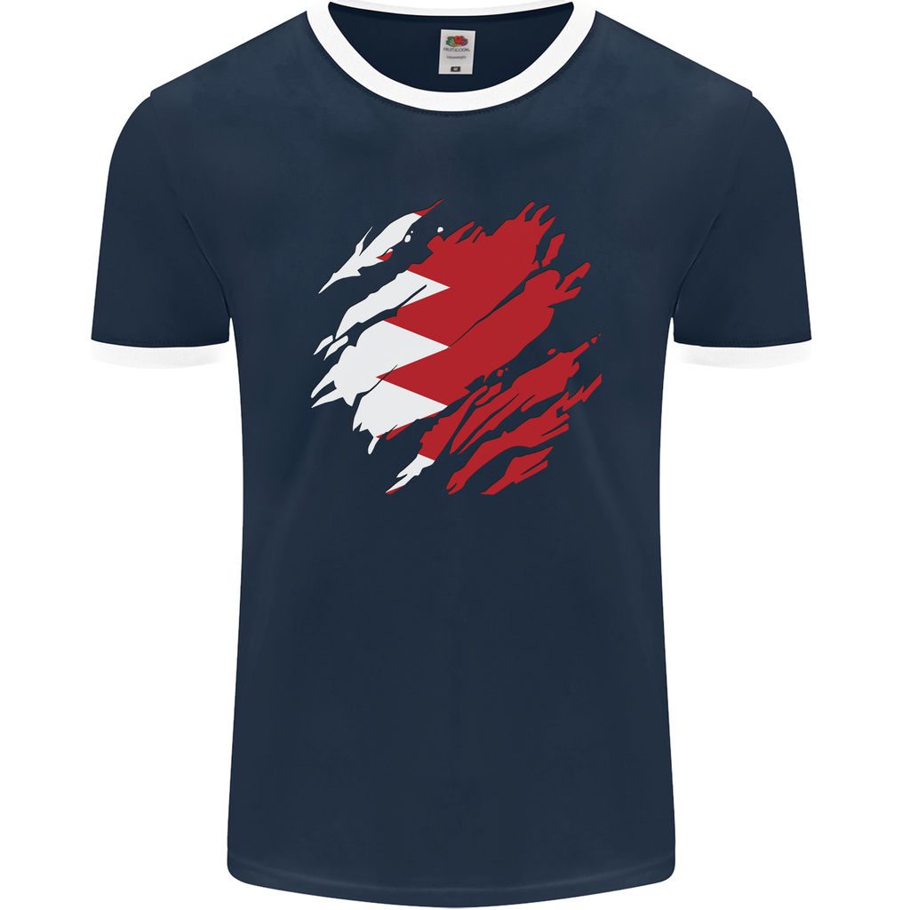 Embrace your Bahraini heritage and show your support with the Torn Bahrain Flag Bahraini Day Football Men's Ringer T-Shirt by FotL. This stylish and comfortable t-shirt is perfect for representing your pride on Bahraini Day or any day!