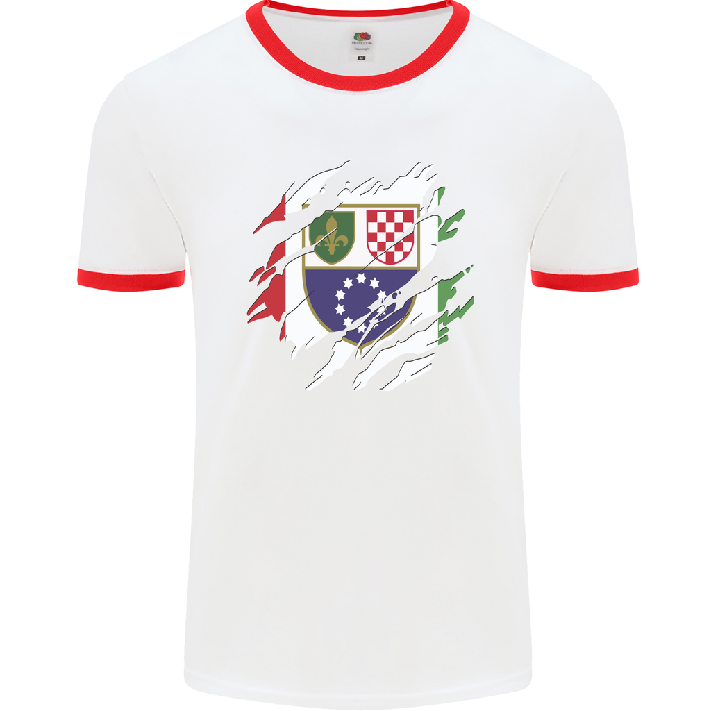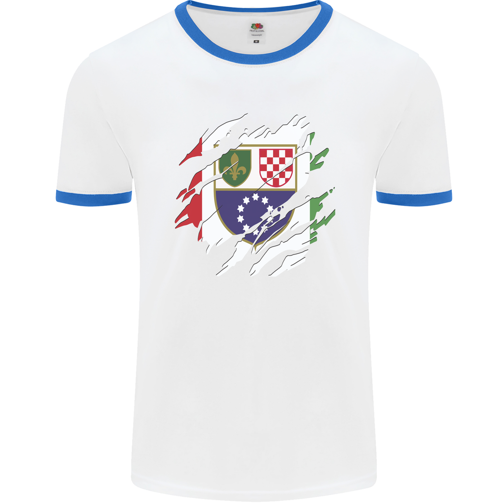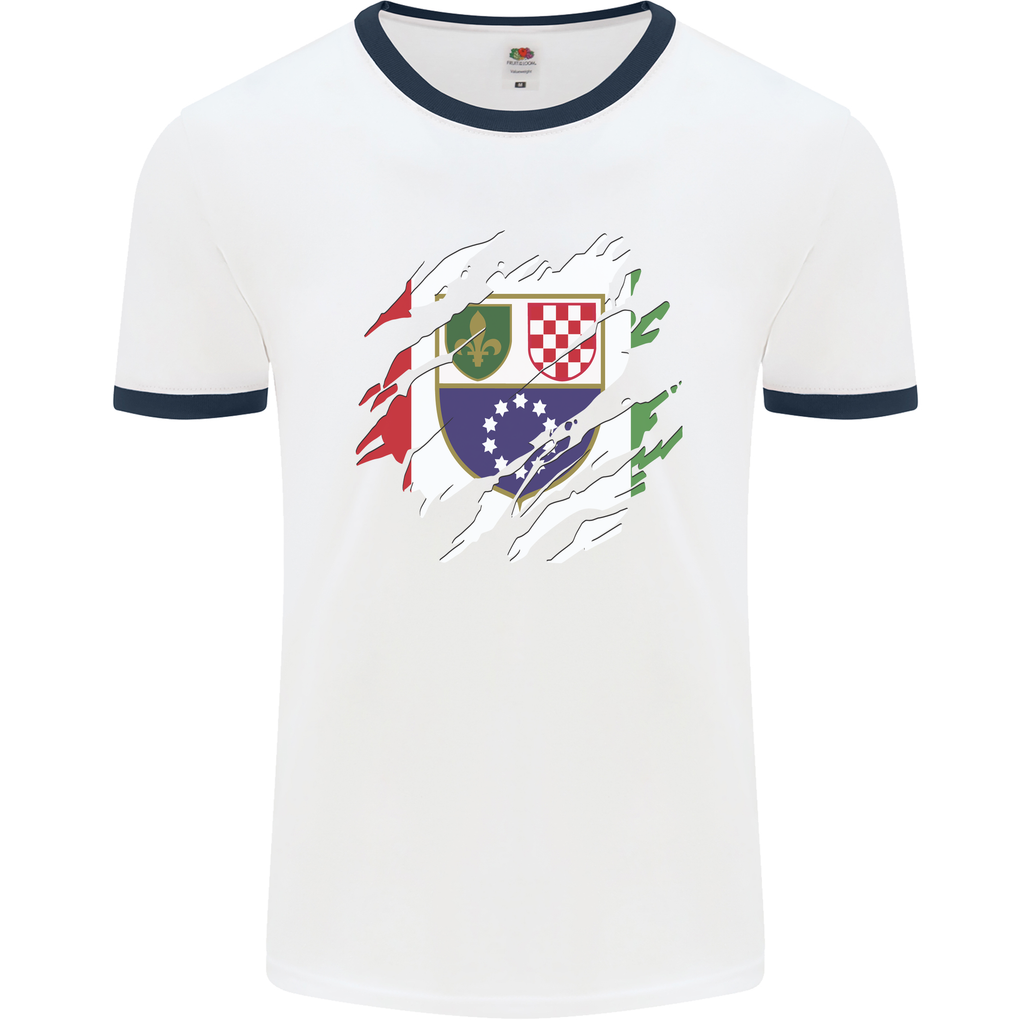 Welcome to the trendiest addition to your wardrobe - the Torn Bosnia and Herzegovina Flag Day Football Men's Ringer T-Shirt. Perfect for those who love to show off their unique style, this t-shirt combines bold design with unbeatable comfort.