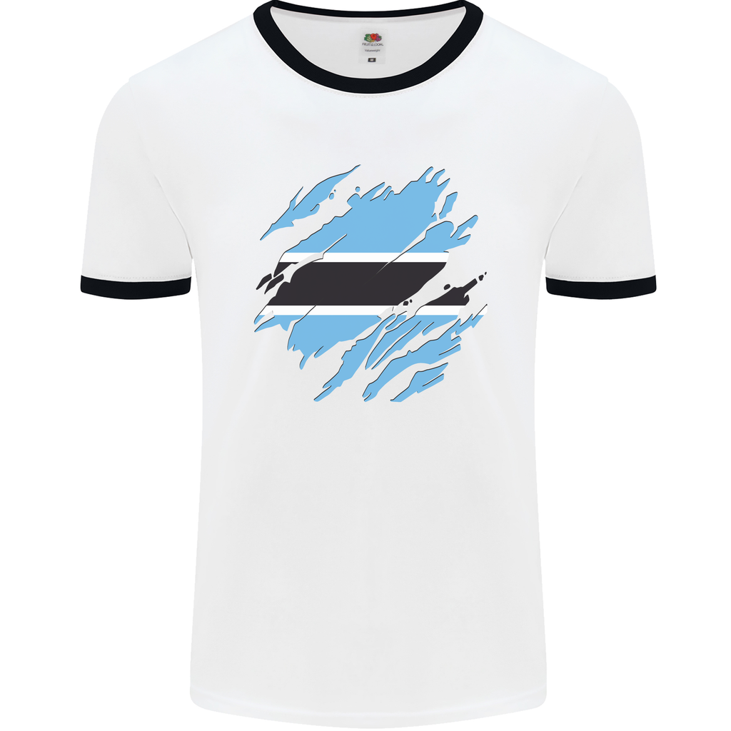 Experience pride and style with our Torn Botswana Flag Batswana Day Football Men's Ringer T-Shirt. Designed to celebrate Batswana Day with a unique twist, this t-shirt embodies a blend of sporty elegance and patriotic fervour.