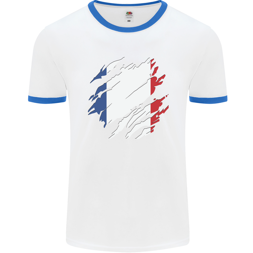 Embrace your patriotism and love for football with the Torn France Flag French Day Football Men's Ringer T-Shirt. This striking tee pays homage to both the French national flag and the passion for the beautiful game.