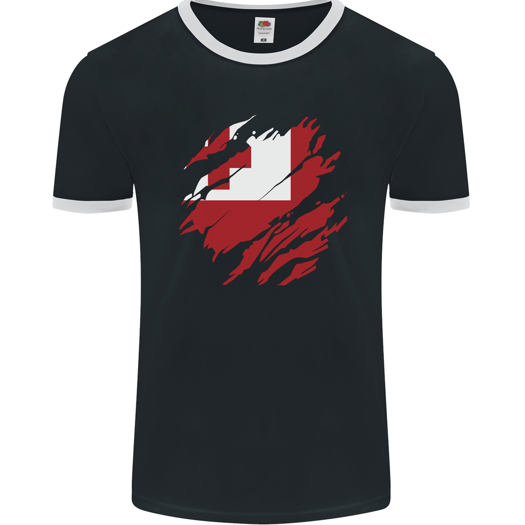 Elevate your wardrobe with the Torn Tongan Flag Tongan Day Football Mens Ringer T-shirt by FotL and make a bold statement wherever you go!